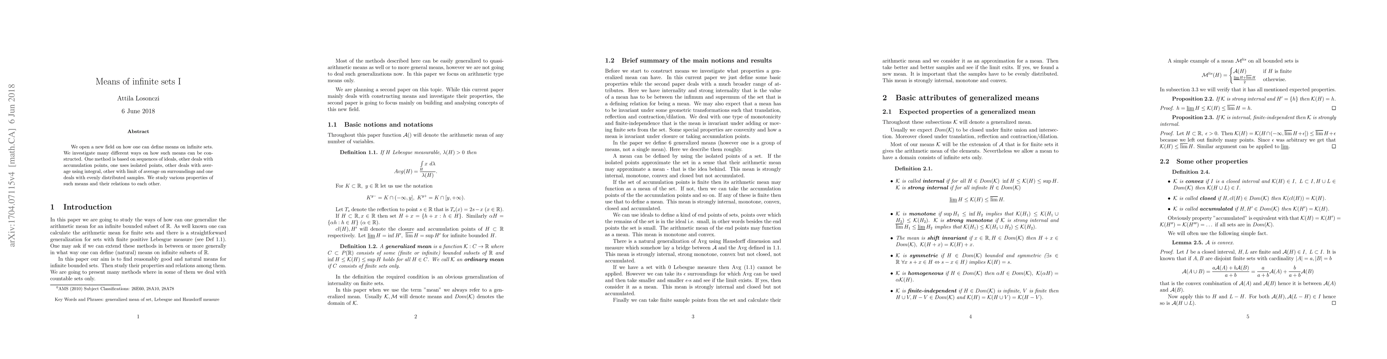 We open a new field on how one can define means on infinite sets. We investigate many different ways on how such means can be constructed. One method is based on sequences of ideals, other deals with accumulation points, one uses isolated points, other deals with average using integral, other with limit of average on surroundings and one deals with evenly distributed samples. We study various properties of such means and their relations to each other.