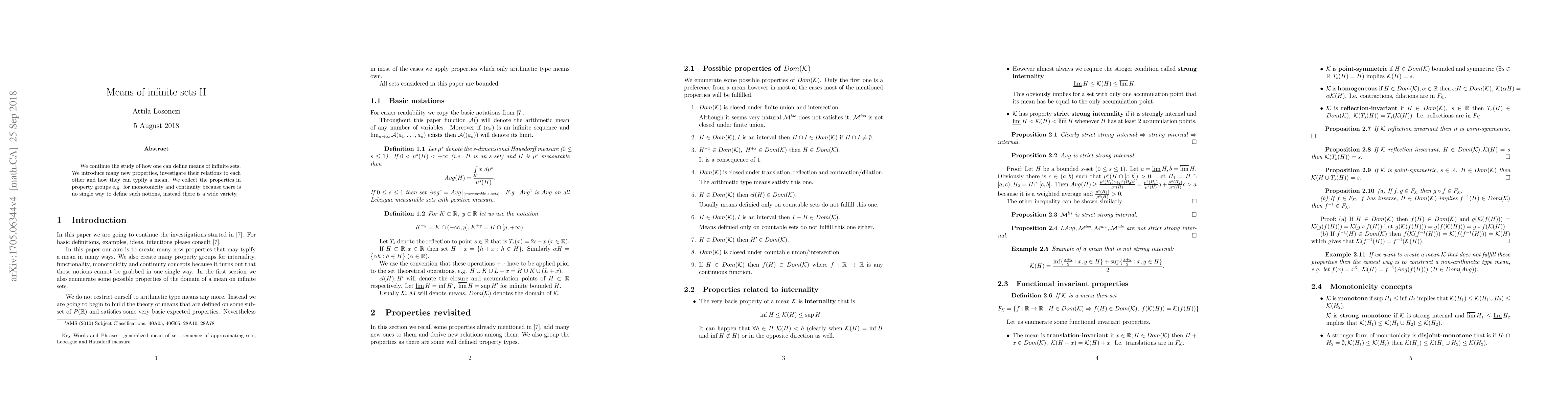 We continue the study of how one can define means of infinite sets. We introduce many new properties, investigate their relations to each other and how they can typify a mean. We collect the properties in property groups e.g. for monotonicity and continuity because there is no single way to define such notions, instead there is a wide variety.