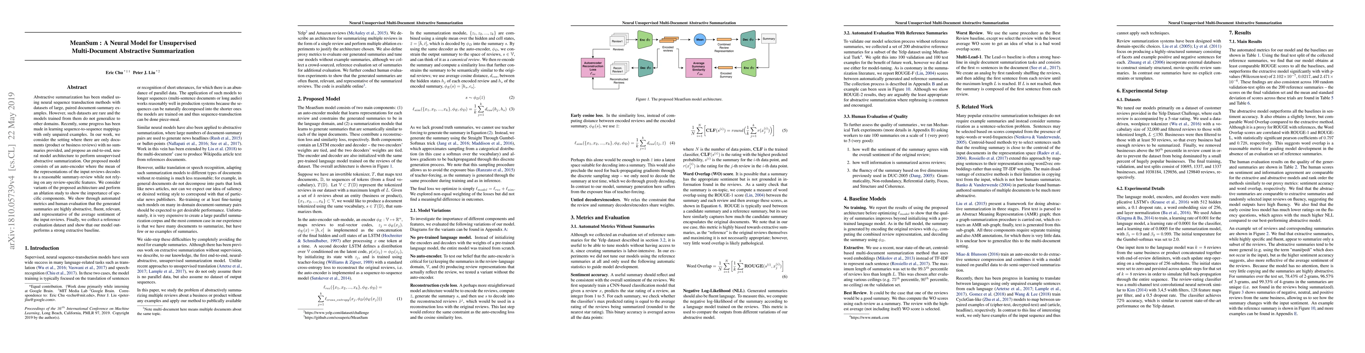 The MeanSum model proposes an unsupervised neural architecture for abstractive summarization of product or business reviews without paired summary examples. The model uses an auto-encoder with mean representation decoding to generate summaries, demonstrating high abstractiveness, fluency, and relevance through automated metrics and human evaluation.
