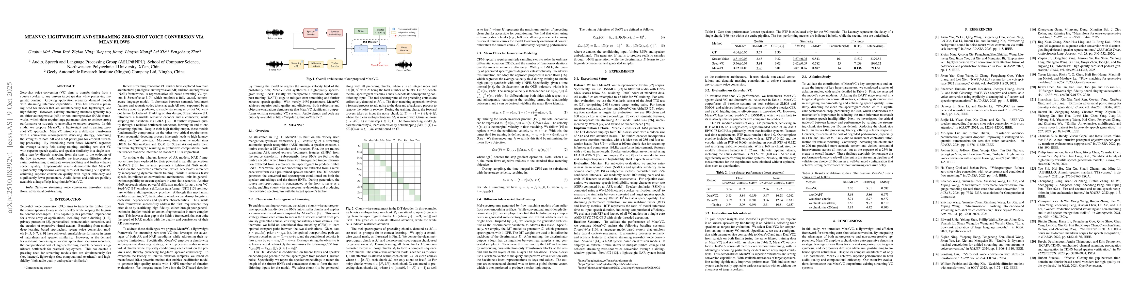 The paper proposes a novel framework combining mean flows and diffusion adversarial post-training for efficient single-step spectrogram synthesis in streaming zero-shot voice conversion.