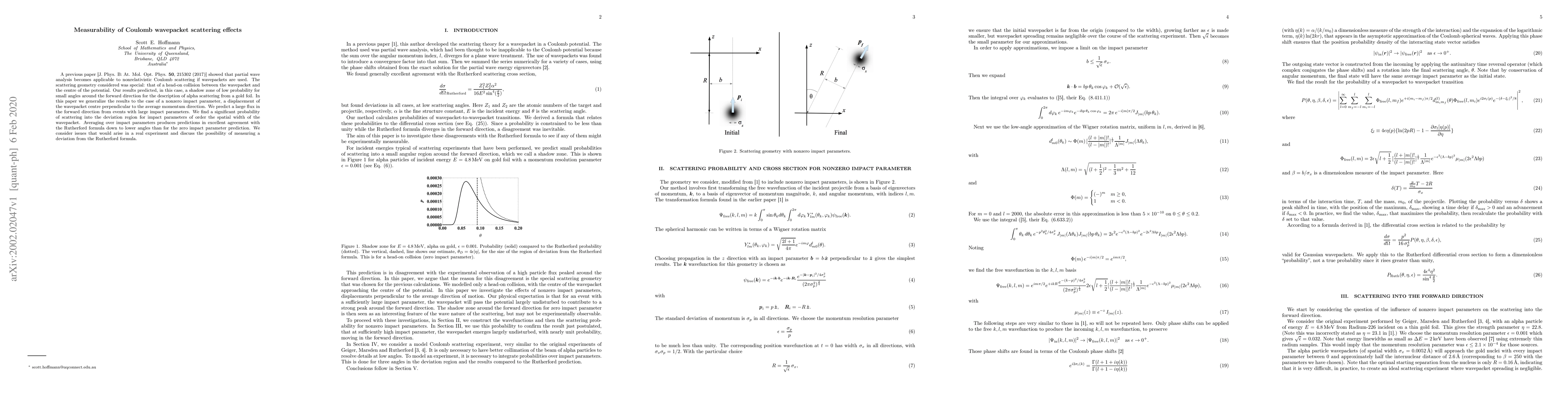 A previous paper [J. Phys. B: At. Mol. Opt. Phys. 50, 215302 (2017)] showed that partial wave analysis becomes applicable to nonrelativistic Coulomb scattering if wavepackets are used. The scattering geometry considered was special: that of a head-on collision between the wavepacket and the centre of the potential. Our results predicted, in this case, a shadow zone of low probability for small angles around the forward direction for the description of alpha scattering from a gold foil. In this paper we generalize the results to the case of a nonzero impact parameter, a displacement of the wavepacket centre perpendicular to the average momentum direction. We predict a large flux in the forward direction from events with large impact parameters. We find a significant probability of scattering into the deviation region for impact parameters of order the spatial width of the wavepacket. Averaging over impact parameters produces predictions in excellent agreement with the Rutherford formula down to lower angles than for the zero impact parameter prediction. We consider issues that would arise in a real experiment and discuss the possibility of measuring a deviation from the Rutherford formula.
