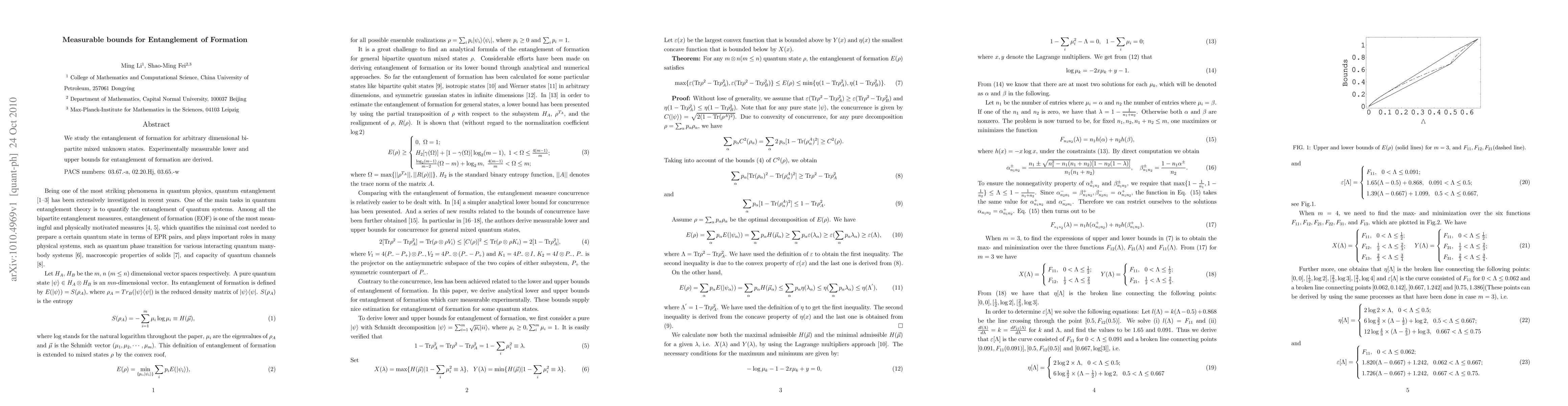 This paper derives experimentally measurable lower and upper bounds for the entanglement of formation in arbitrary dimensional bipartite mixed states, providing a quantitative framework for assessing entanglement in unknown quantum systems.