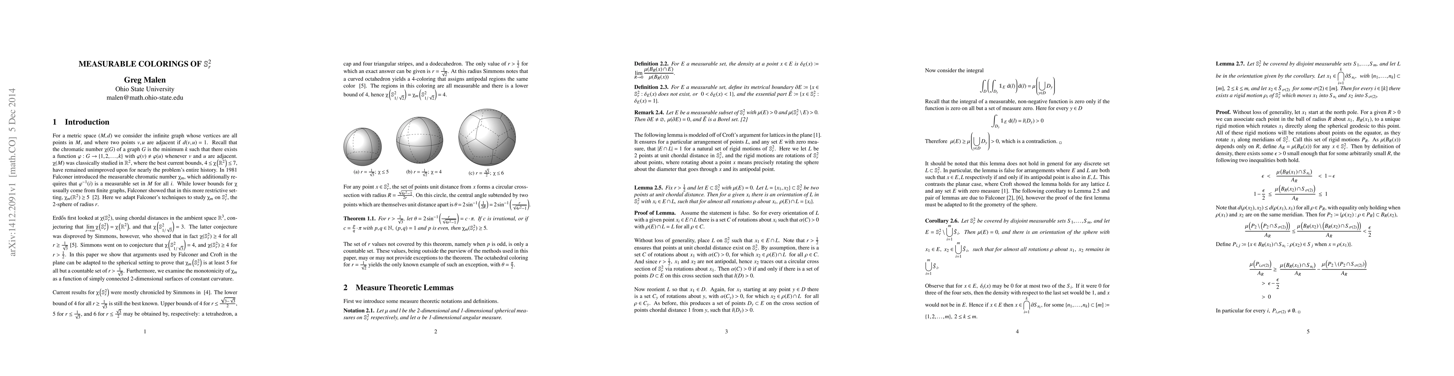 This paper investigates the measurable chromatic number of distance colorings on spheres of different radii, demonstrating that methods for establishing lower bounds in planar colorings apply to all but a countable set of radii. It also reveals that the measurable chromatic number is not a monotonic function of radius or curvature.