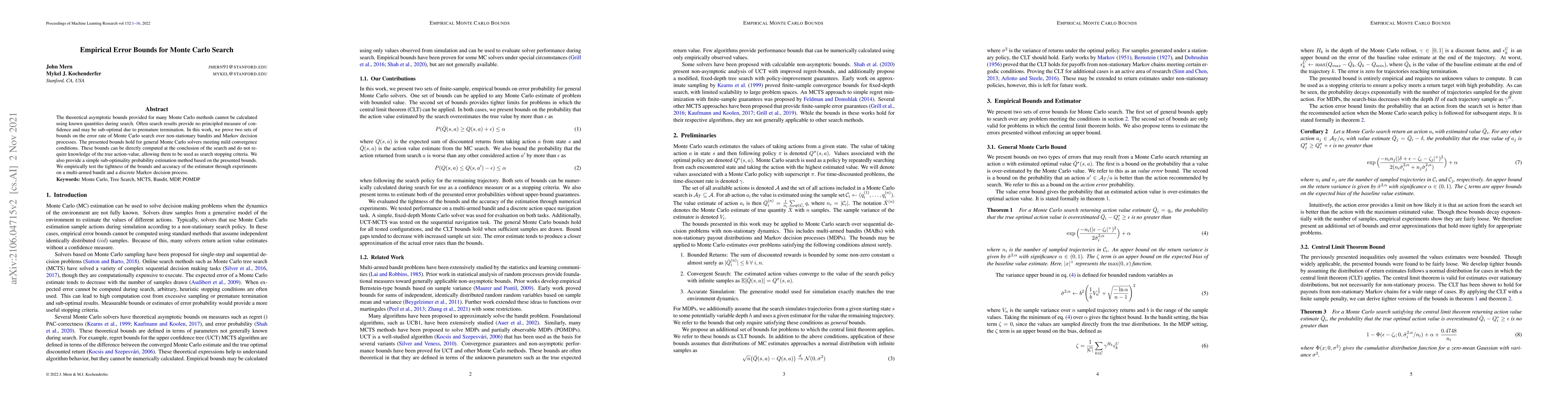 This paper presents computable error bounds for Monte Carlo search methods in non-stationary bandit problems and Markov decision processes, providing a measure of confidence in recommended actions. The bounds are shown to be tight through empirical testing on multi-armed bandit and discrete Markov decision process scenarios.