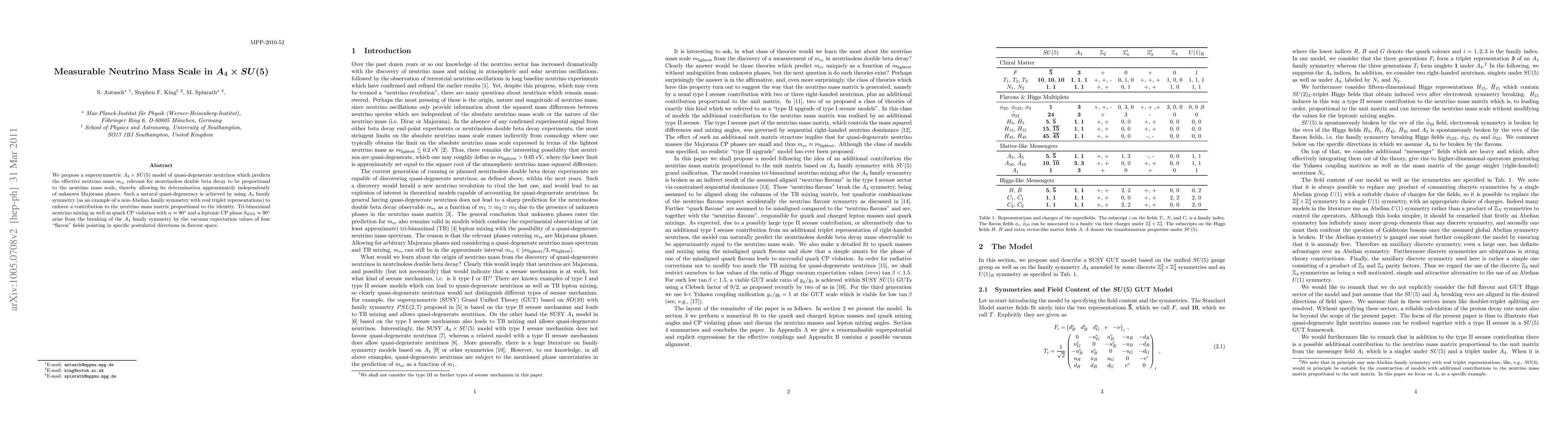 This paper proposes a supersymmetric A4 x SU(5) model predicting quasi-degenerate neutrinos, with the effective neutrino mass proportional to the neutrino mass scale, allowing its determination independently of Majorana phases. Tri-bimaximal neutrino mixing is achieved through A4 family symmetry and a type I seesaw contribution.