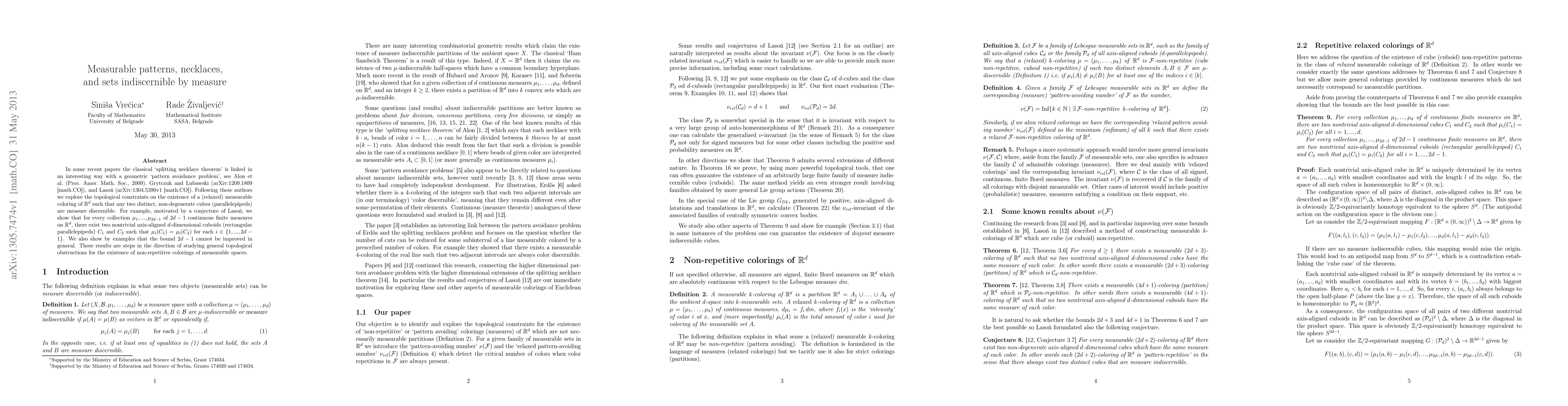 In some recent papers the classical `splitting necklace theorem' is linked in an interesting way with a geometric `pattern avoidance problem'. We explore the topological constraints on the existence of a (relaxed) measurable coloring of R^d such that any two distinct, non-degenerate cubes (parallelepipeds) are measure discernible. For example, motivated by a conjecture of Lason, we show that for every collection \mu_1,...,\mu_{2d-1} of 2d-1 continuous finite measures on R^d, there exist two nontrivial axis-aligned d-dimensional cuboids (rectangular parallelepipeds) C_1 and C_2 such that \mu_i(C_1)=\mu_i(C_2) for each i=1,...,2d-1. We also show by examples that the bound 2d-1 cannot be improved in general. These results are steps in the direction of studying general topological obstructions for the existence of non-repetitive colorings of measurable spaces.