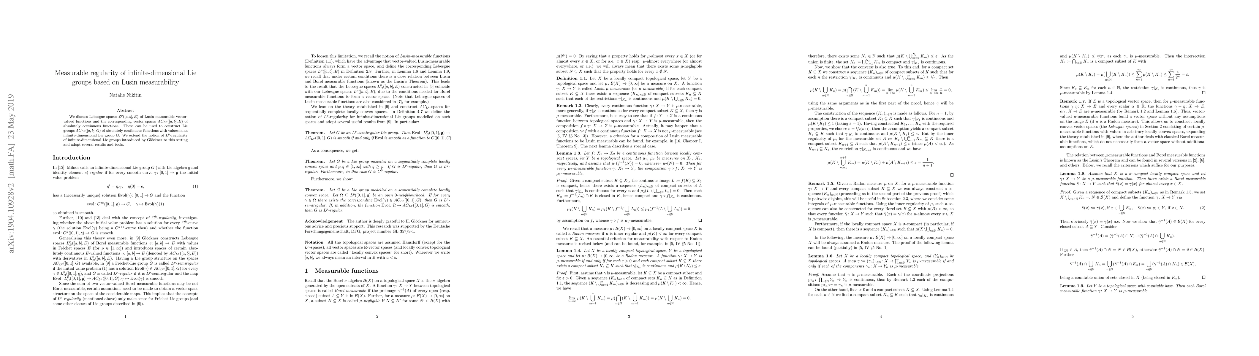 This paper explores the construction of infinite-dimensional Lie groups using Lusin measurable vector-valued functions and absolutely continuous functions in Lebesgue spaces. It extends the concept of $L^p$-regularity for these groups, building on previous work by Glöckner.