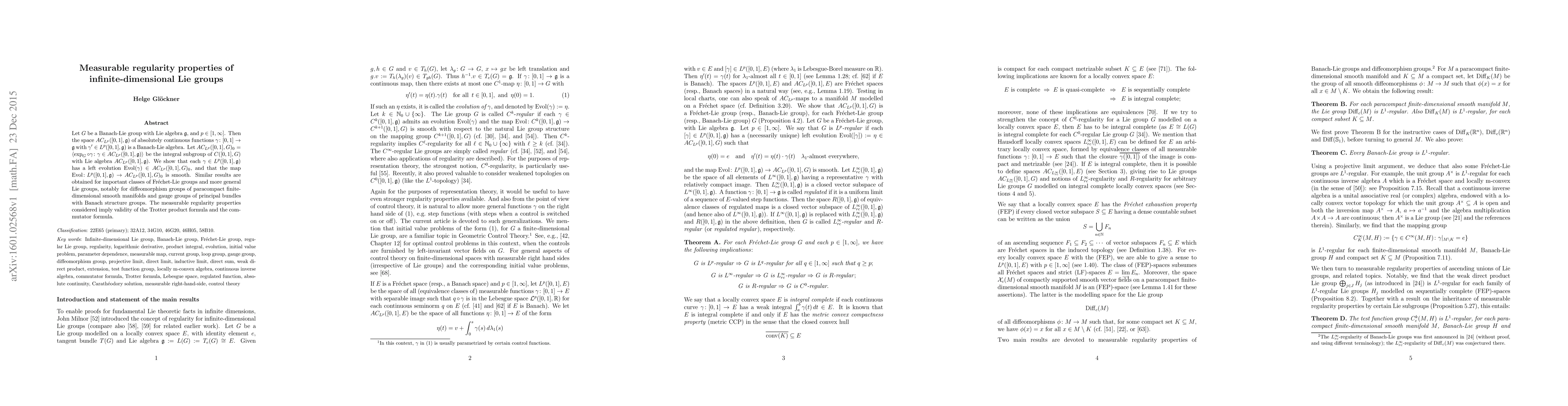 This paper investigates the regularity properties of infinite-dimensional Lie groups, proving that Banach-Lie groups and various direct limits of finite-dimensional Lie groups are L^1-regular. It demonstrates that L^1-regularity implies the validity of the Trotter product formula and the commutator formula, and extends these results to weaker measurable regularity properties like L^p-regularity.