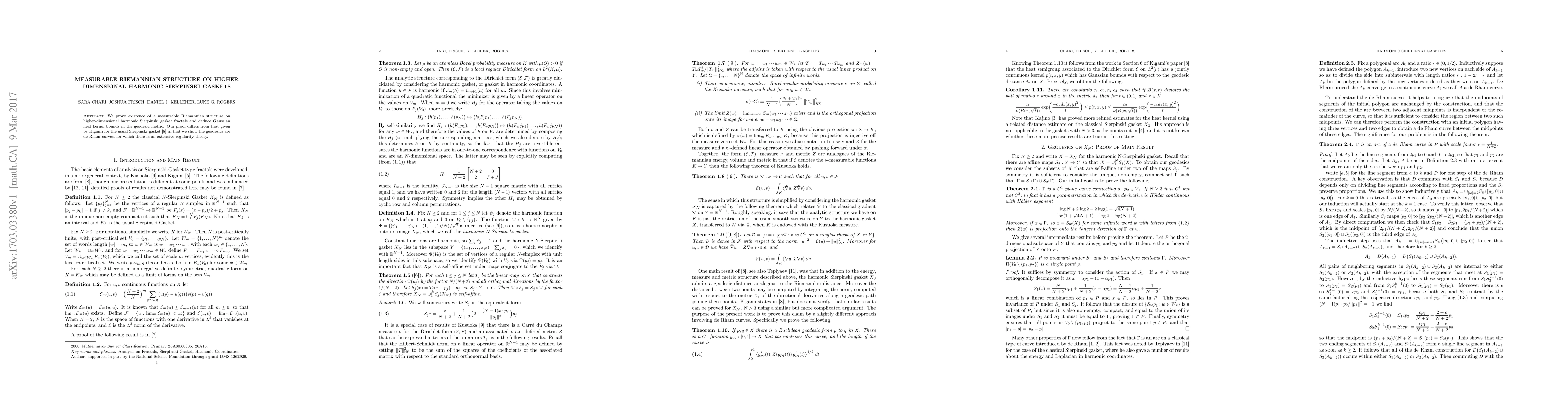 This paper proves the existence of a measurable Riemannian structure on higher-dimensional harmonic Sierpinski gaskets, establishing Gaussian heat kernel bounds in the geodesic metric. The proof leverages the regularity of geodesics as de Rham curves, contrasting with Kigami's method for the usual Sierpinski gasket.