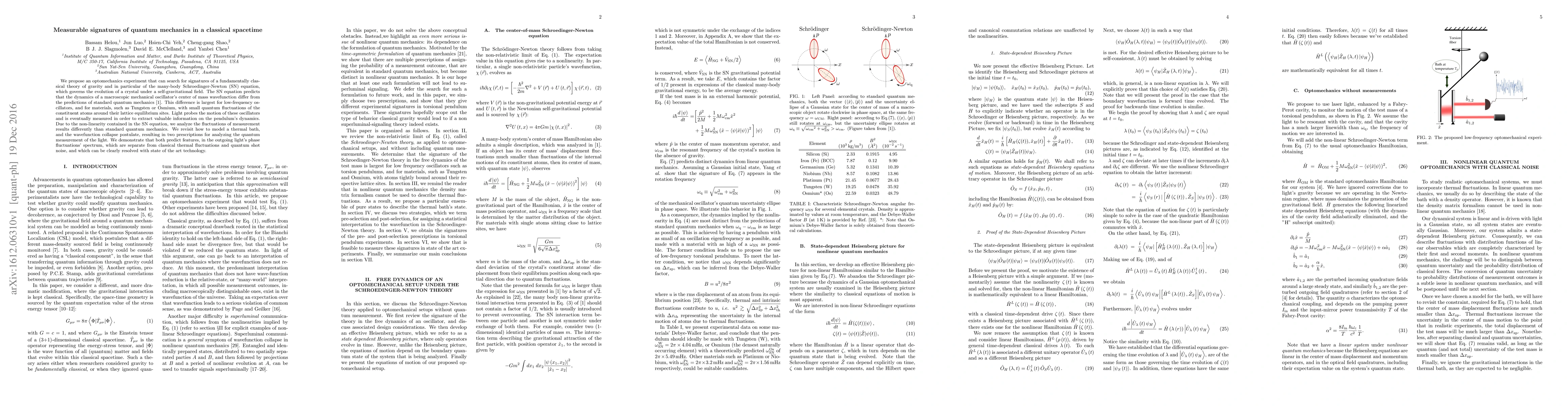 We propose an optomechanics experiment that can search for signatures of a fundamentally classical theory of gravity and in particular of the many-body Schroedinger-Newton (SN) equation, which governs the evolution of a crystal under a self-gravitational field. The SN equation predicts that the dynamics of a macroscopic mechanical oscillator's center of mass wavefunction differ from the predictions of standard quantum mechanics. This difference is largest for low-frequency oscillators, and for materials, such as Tungsten or Osmium, with small quantum fluctuations of the constituent atoms around their lattice equilibrium sites. Light probes the motion of these oscillators and is eventually measured in order to extract valuable information on the pendulum's dynamics. Due to the non-linearity contained in the SN equation, we analyze the fluctuations of measurement results differently than standard quantum mechanics. We revisit how to model a thermal bath, and the wavefunction collapse postulate, resulting in two prescriptions for analyzing the quantum measurement of the light. We demonstrate that both predict features, in the outgoing light's phase fluctuations' spectrum, which are separate from classical thermal fluctuations and quantum shot noise, and which can be clearly resolved with state of the art technology.