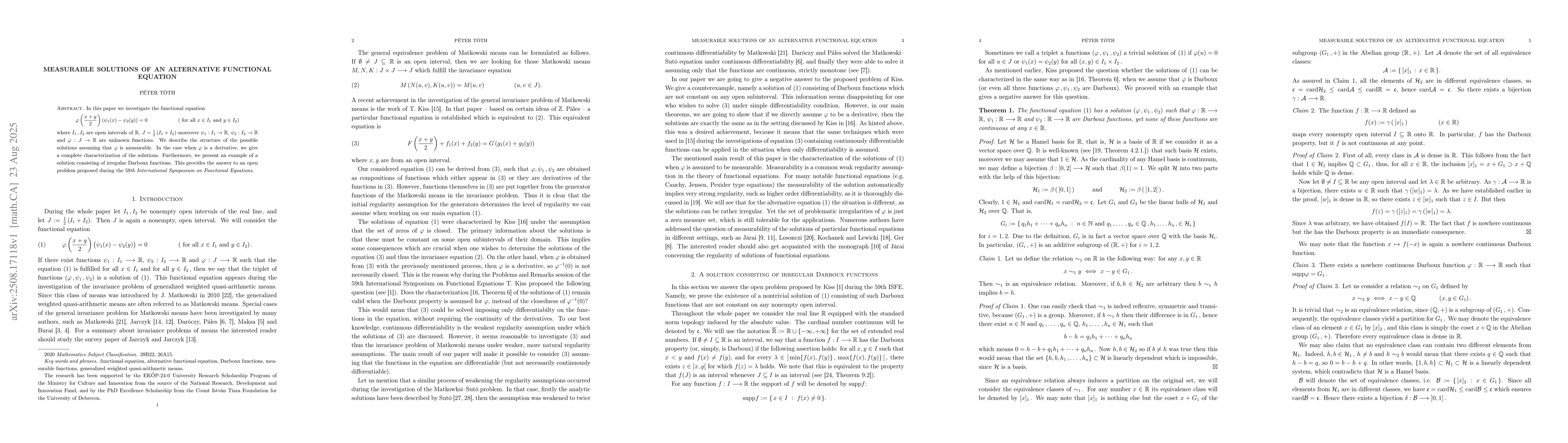 In this paper we investigate the functional equation \[ \varphi \left( \frac{x+y}{2} \right) \left( \psi_1(x) - \psi_2(y) \right) = 0 \hspace{20mm} \left( \mbox{ for all } x \in I_1 \mbox{ and } y \in I_2 \right) \] where $ I_1 \,, I_2 $ are open intervals of $ \mathbb{R} $, $ J = \frac{1}{2} \left( I_1 + I_2 \right) $ moreover $ \psi_1 : I_1 \rightarrow \mathbb{R} $, $ \psi_2 : I_2 \rightarrow \mathbb{R} $ and $ \varphi : J \rightarrow \mathbb{R} $ are unknown functions. We describe the structure of the possible solutions assuming that $ \varphi $ is measurable. In the case when $ \varphi $ is a derivative, we give a complete characterization of the solutions. Furthermore, we present an example of a solution consisting of irregular Darboux functions. This provides the answer to an open problem proposed during the 59th International Symposium on Functional Equations.