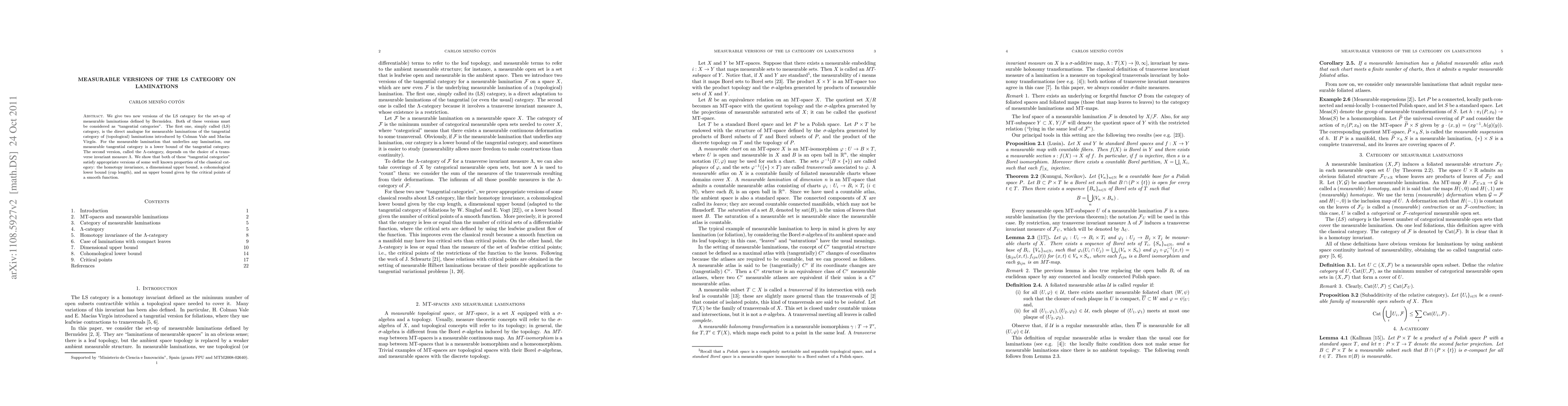 Researchers developed two new versions of a mathematical concept called the LS category for measurable laminations, which provide lower bounds to the tangential category and demonstrate properties such as homotopy invariance and dimensional upper bounds.