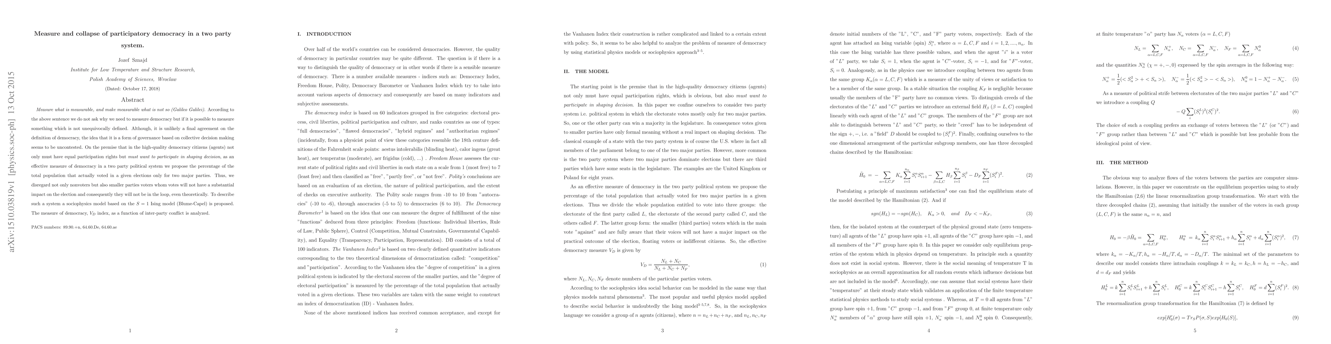 Measure what is measurable, and make measurable what is not so (Galileo Galilei). According to the above sentence we do not ask why we need to measure democracy but if it is possible to measure something which is not unequivocally defined. Although, it is unlikely a final agreement on the definition of democracy, the idea that it is a form of governance based on collective decision making seems to be uncontested. On the premise that in the high-quality democracy citizens (agents) not only must have equal participation rights but must want to participate in shaping decision, as an effective measure of democracy in a two party political system we propose the percentage of the total population that actually voted in a given elections only for two major parties. Thus, we disregard not only nonvoters but also smaller parties voters whom votes will not have a substantial impact on the election and consequently they will not be in the loop, even theoretically. To describe such a system a sociophysics model based on the $S=1$ Ising model (Blume-Capel) is proposed. The measure of democracy, V_D index, as a function of inter-party conflict is analyzed.
