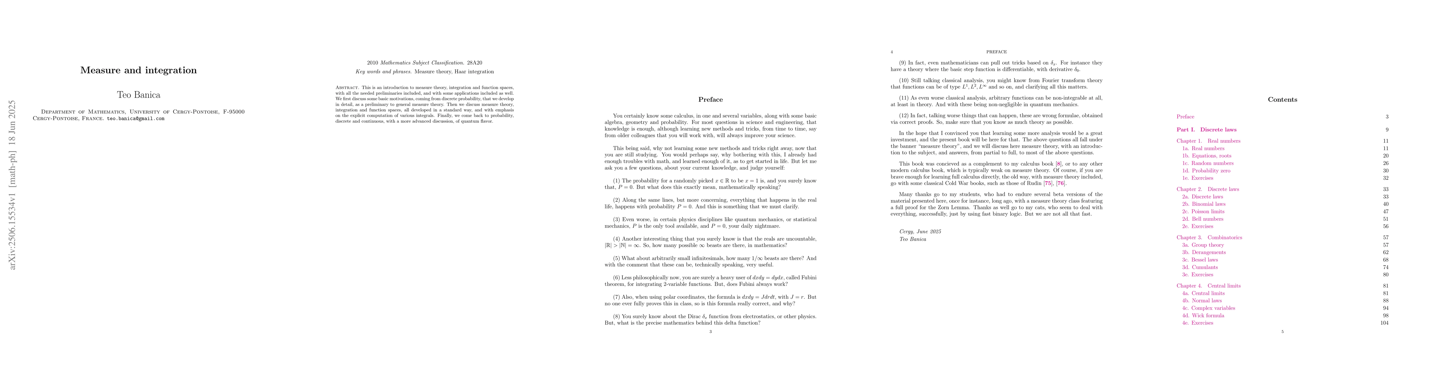 This is an introduction to measure theory, integration and function spaces, with all the needed preliminaries included, and with some applications included as well. We first discuss some basic motivations, coming from discrete probability, that we develop in detail, as a preliminary to general measure theory. Then we discuss measure theory, integration and function spaces, all developed in a standard way, and with emphasis on the explicit computation of various integrals. Finally, we come back to probability, discrete and continuous, with a more advanced discussion, of quantum flavor.