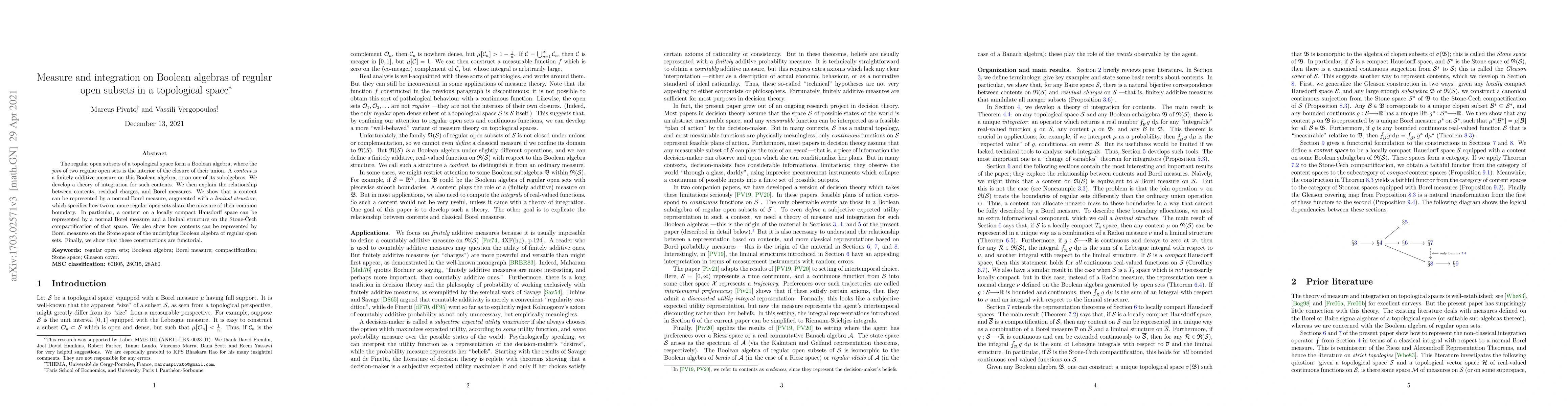 The regular open subsets of a topological space form a Boolean algebra, where the `join' of two regular open sets is the interior of the closure of their union. A `credence' is a finitely additive probability measure on this Boolean algebra, or on one of its subalgebras. We develop a theory of integration for such credences. We then explain the relationship between credences, residual charges, and Borel probability measures. We show that a credence can be represented by a normal Borel measure, augmented with a `liminal structure', which specifies how two or more regular open sets share the probability mass of their common boundary. In particular, a credence on a locally compact Hausdorff space can be represented by a normal Borel measure and a liminal structure on the Stone-\v{C}ech compactification of that space. We also show how credences can be represented by Borel measures on the Stone space of the underlying Boolean algebra of regular open sets. Finally, we show that these constructions are functorial.