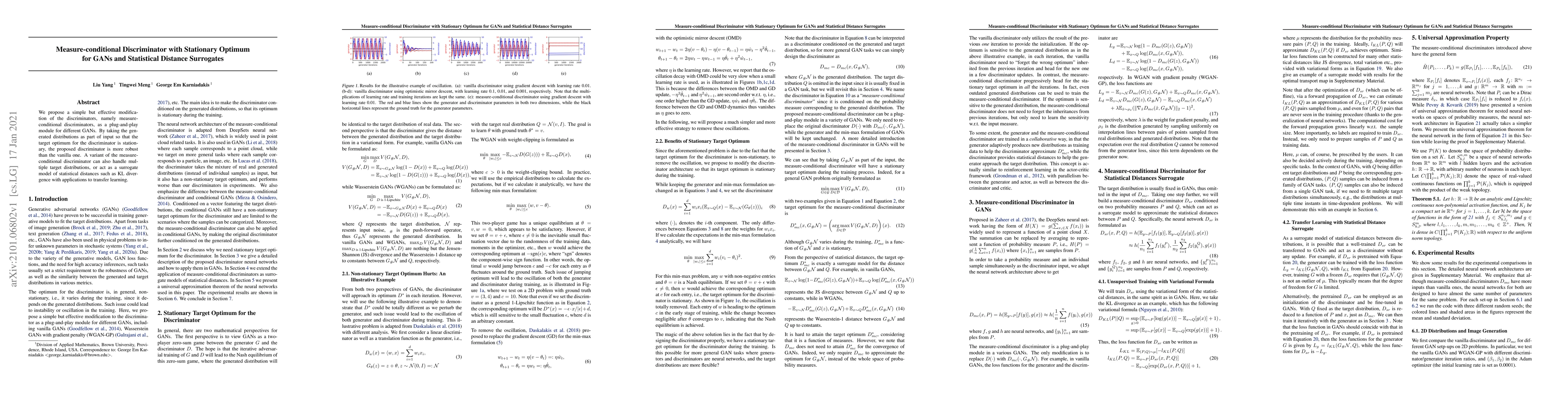 This paper introduces a measure-conditional discriminator for GANs that incorporates generated distributions to achieve a stationary optimum, enhancing robustness. It also proposes a variant that can manage multiple target distributions and act as a surrogate for statistical distances, useful for transfer learning.