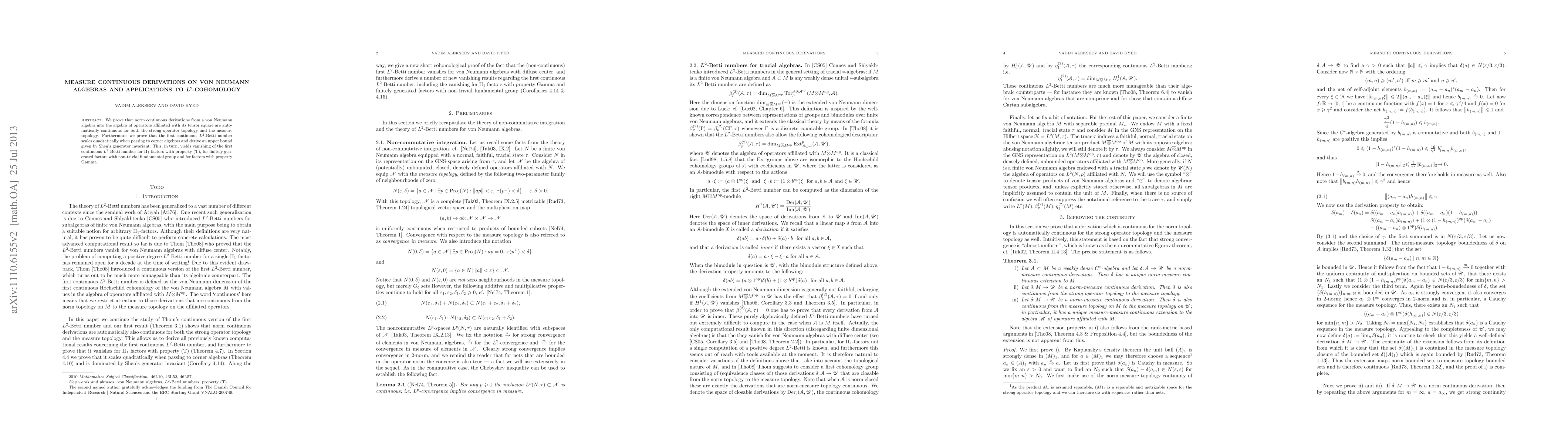 Summary: This paper establishes the continuity of norm continuous derivations in von Neumann algebras for both strong and measure topologies, and demonstrates that the first continuous L^2-Betti number scales quadratically for corner algebras, leading to its vanishing in specific classes of II_1 factors.