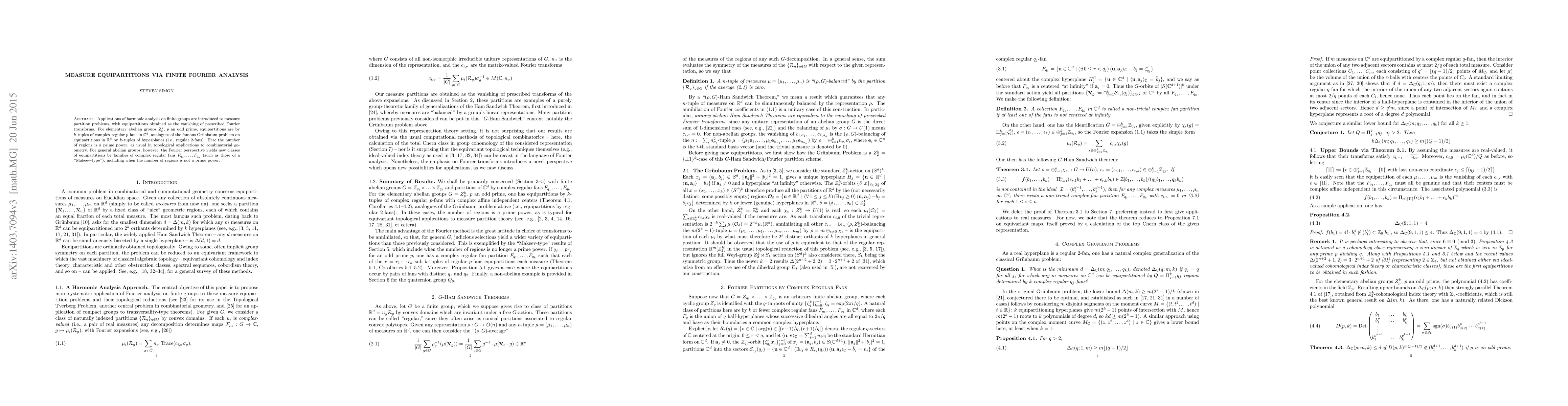 Applications of harmonic analysis on finite groups are introduced to measure partition problems, with equipartitions obtained as the vanishing of prescribed Fourier transforms. For elementary abelian groups $Z_p^k$, $p$ an odd prime, equipartitions are by $k$-tuples of complex regular $p$-fans in $\mathbb{C}^d$, analogues of the famous Gr\"unbaum problem on equipartitions in $\mathbb{R}^d$ by $k$-tuples of hyperplanes (i.e., regular 2-fans). Here the number of regions is a prime power, as usual in topological applications to combinatorial geometry. For general abelian groups, however, the Fourier perspective yields new classes of equipartitions by families of complex regular fans $F_{q_1},\ldots, F_{q_k}$ (such as those of a "Makeev-type"), including when the number of regions is not a prime power.