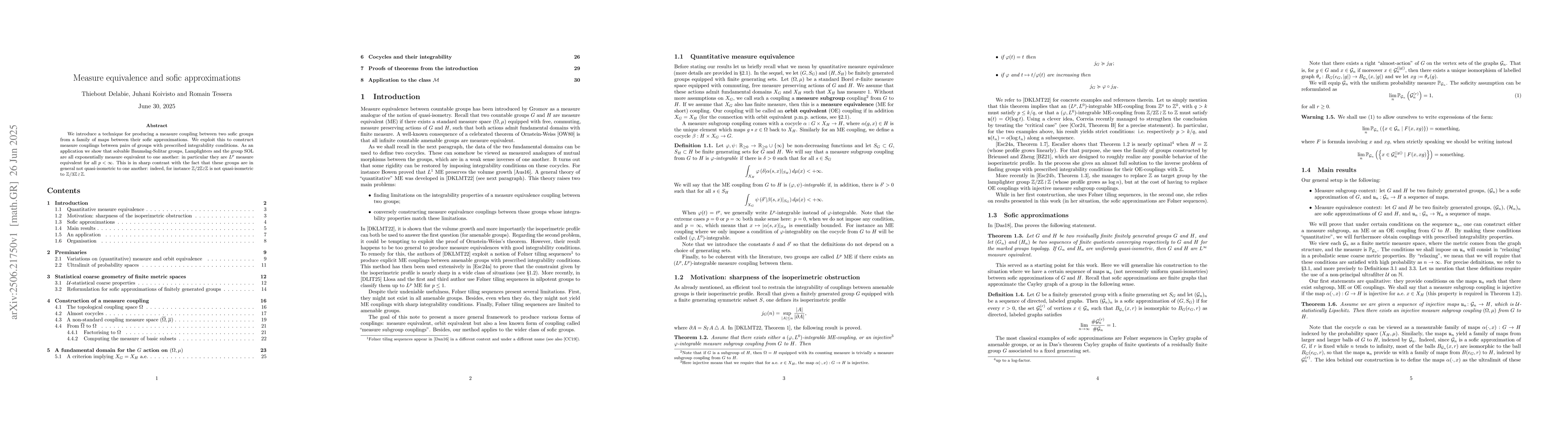 We introduce a technique for producing a measure coupling between two sofic groups from a family of maps between their sofic approximations. We exploit this to construct measure couplings between pairs of groups with prescribed integrability conditions. As an application we show that solvable Baumslag-Solitar groups, Lamplighters and the group SOL are all exponentially measure equivalent to one another: in particular they are L^p measure equivalent for all p. This is in sharp contrast with the fact that these groups are in general not quasi-isometric to one another: indeed, for instance the lamplighter with lamp group Z/3Z is not quasi-isometric the lamplighter with lamp group Z/2Z.