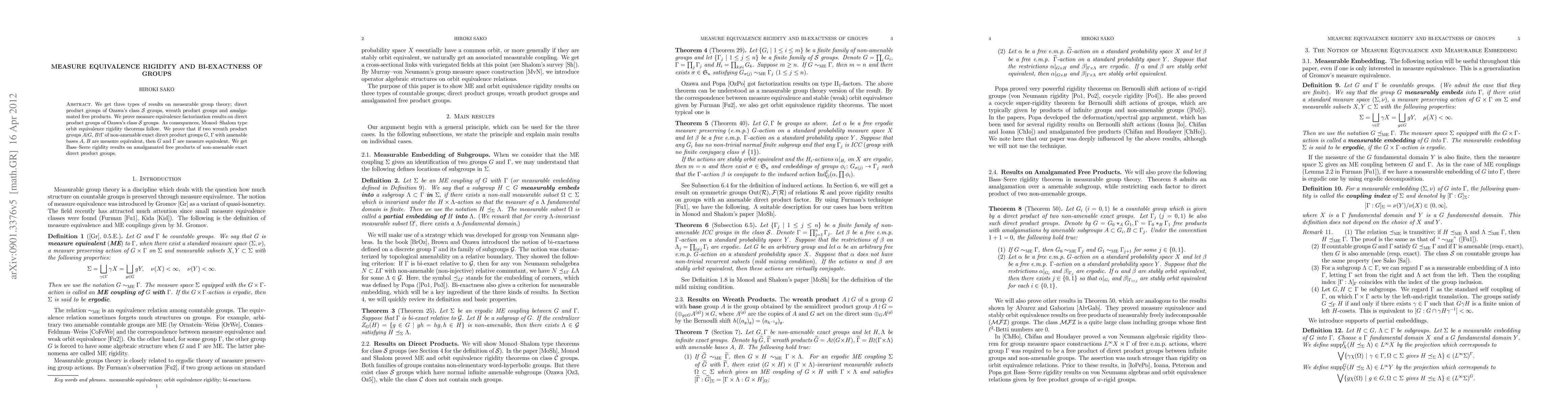 The paper establishes new measure equivalence rigidity theorems for direct product groups of Ozawa's class $\mathcal{S}$, wreath product groups, and amalgamated free products, linking bi-exactness with orbit equivalence and measure equivalence.