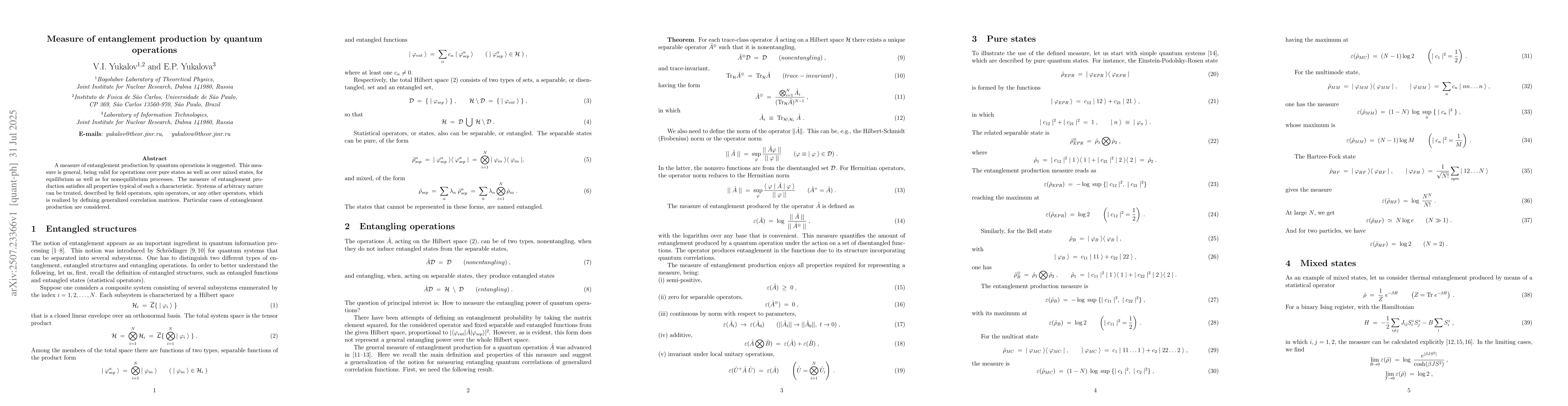 A measure of entanglement production by quantum operations is suggested. This measure is general, being valid for operations over pure states as well as over mixed states, for equilibrium as well as for nonequilibrium processes. The measure of entanglement production satisfies all properties typical of such a characteristic. Systems of arbitrary nature can be treated, described by field operators, spin operators, or any other operators, which is realized by defining generalized correlation matrices. Particular cases of entanglement production are considered.