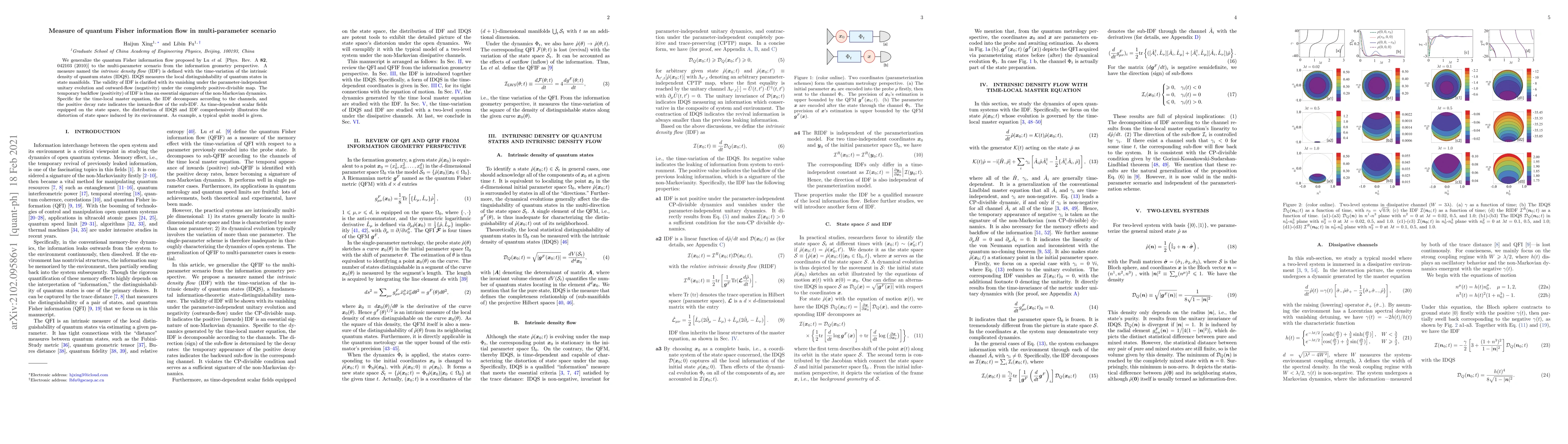 We generalize the quantum Fisher information flow proposed by Lu \textit{et al}. [Phys. Rev. A \textbf{82}, 042103 (2010)] to the multi-parameter scenario from the information geometry perspective. A measure named the \textit{intrinsic density flow} (IDF) is defined with the time-variation of the intrinsic density of quantum states (IDQS). IDQS measures the local distinguishability of quantum states in state manifolds. The validity of IDF is clarified with its vanishing under the parameter-independent unitary evolution and outward-flow (negativity) under the completely positive-divisible map. The temporary backflow (positivity) of IDF is thus an essential signature of the non-Markovian dynamics. Specific for the time-local master equation, the IDF decomposes according to the channels, and the positive decay rate indicates the inwards flow of the sub-IDF. As time-dependent scalar fields equipped on the state space, the distribution of IDQS and IDF comprehensively illustrates the distortion of state space induced by its environment. As example, a typical qubit model is given.