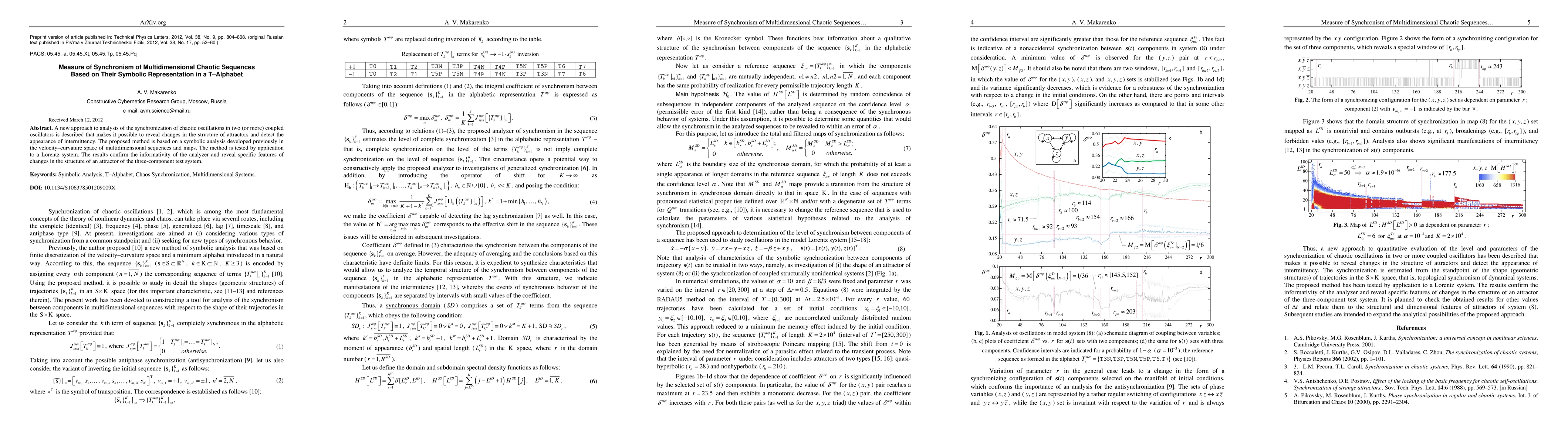 A new approach to analysis of the synchronization of chaotic oscillations in two (or more) coupled oscillators is described that makes it possible to reveal changes in the structure of attractors and detect the appearance of intermittency. The proposed method is based on a symbolic analysis developed previously in the velocity-curvature space of multidimensional sequences and maps. The method is tested by application to a Lorentz system. The results confirm the informativity of the analyzer and reveal specific features of changes in the structure of an attractor of the three-component test system.