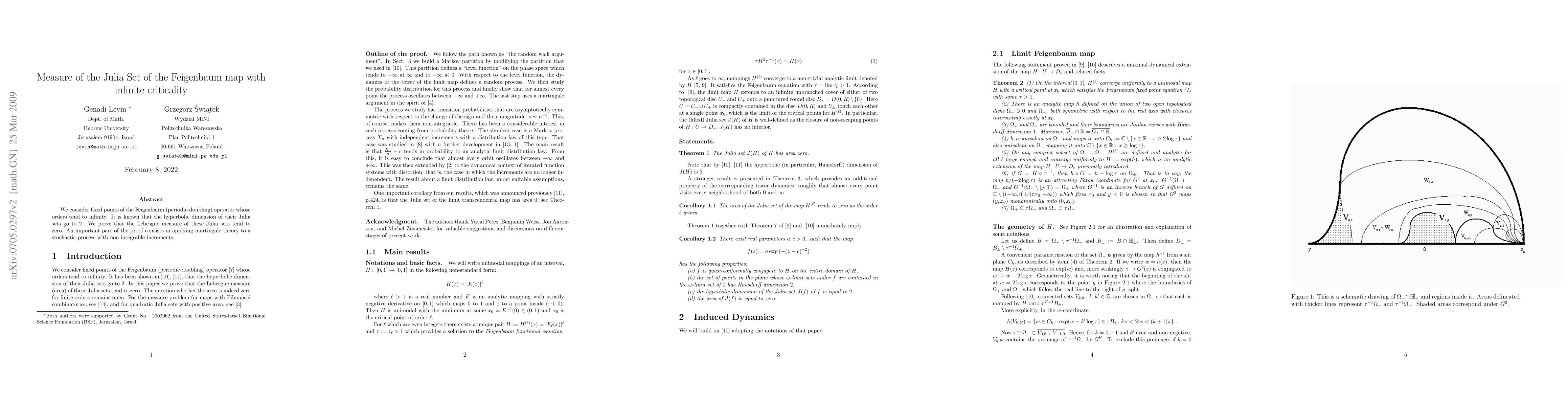 Researchers prove that the Lebesgue measure of Julia sets from the Feigenbaum map with infinite criticality tends to zero, contradicting previous knowledge about their hyperbolic dimension.