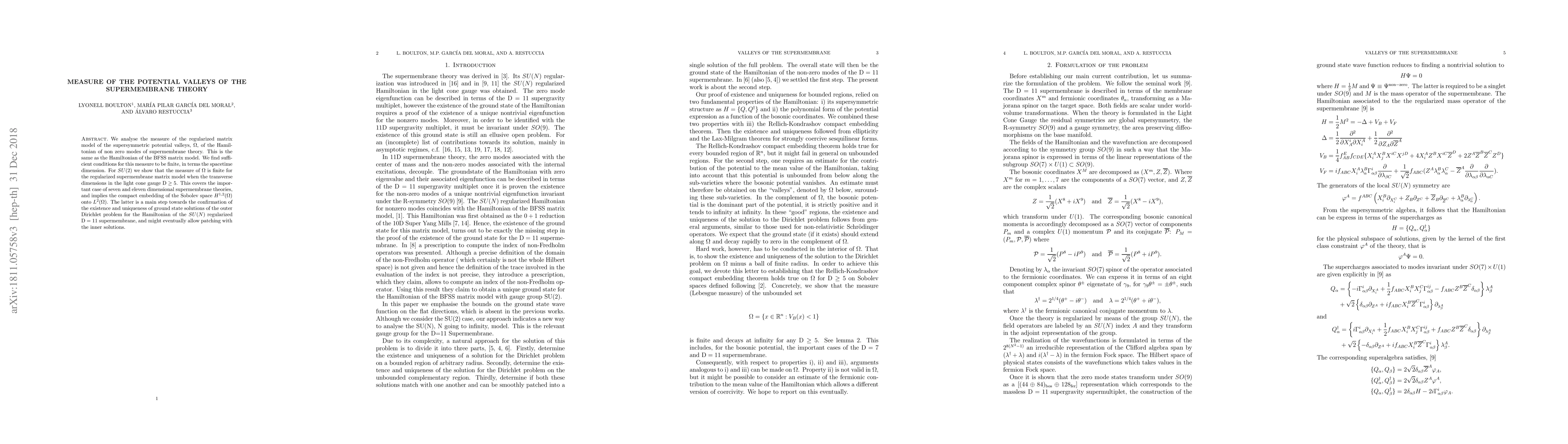 This paper investigates the finiteness conditions for the measure of supersymmetric potential valleys in the Hamiltonian of non-zero modes of the supermembrane theory, showing that it is finite for $SU(2)$ when the transverse dimensions are at least five. This supports the existence and uniqueness of ground state solutions in the $SU(N)$ regularized 11-dimensional supermembrane theory.