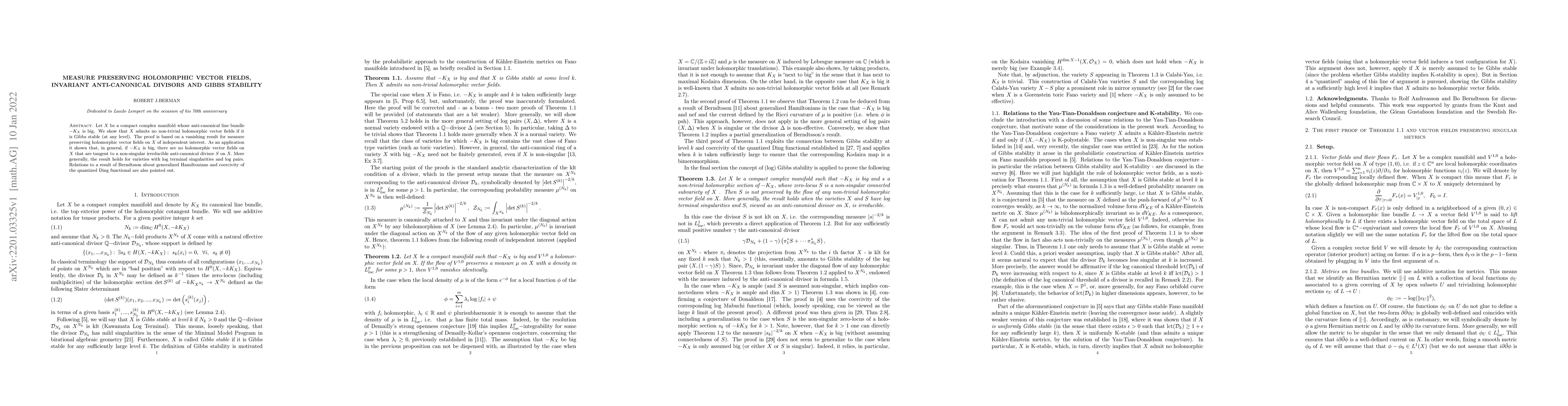 Let X be a compact complex manifold whose anti-canonical line bundle is big. We show that X admits no non-trivial holomorphic vector fields if it is Gibbs stable (at any level). The proof is based on a vanishing result for measure preserving holomorphic vector fields on X of independent interest. As an application it shown that, in general, if the anti-canonical line bundle is big, there are no holomorphic vector fields on X that are tangent to a non-singular irreducible anti-canonical divisor S on X. More generally, the result holds for varieties with log terminal singularities and log pairs. Relations to a result of Berndtsson about generalized Hamiltonians and coercivity of the quantized Ding functional are also pointed out.