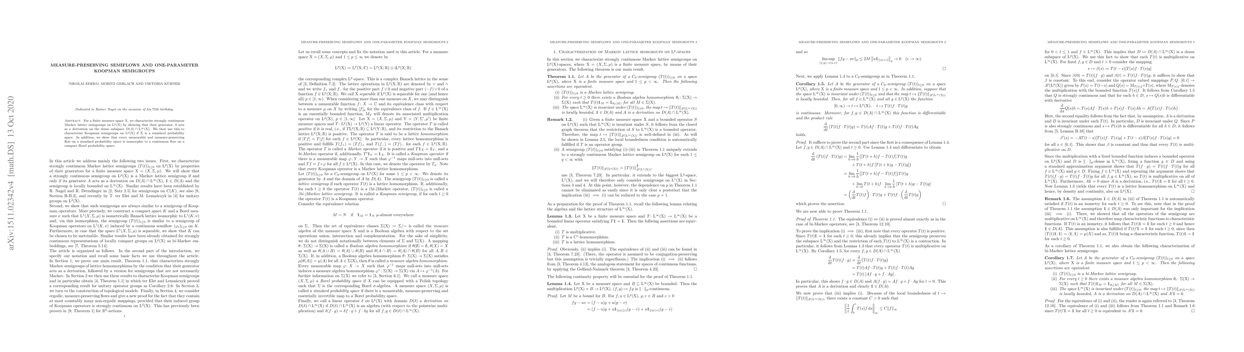 We characterize Markov lattice semigroups induced by measurable semiflows on probability spaces by properties of their generators. In addition we construct topological models on compact spaces for such semigroups.