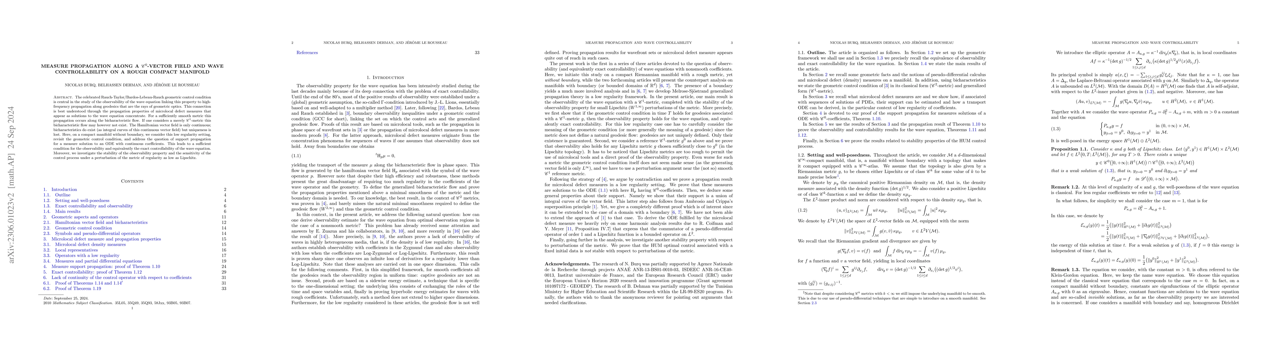 The celebrated Rauch-Taylor/Bardos-Lebeau-Rauch geometric control condition is central in the study of the observability of the wave equation linking this property to high-frequency propagation along geodesics that are therays of geometric optics. This connection is best understood through the propagation properties of microlocal defect measures that appear as solutions to the wave equation concentrate. For a sufficiently smooth metric this propagation occurs along the bicharacteristic flow. If one considers a merely $\mathscr{C}^1$-metric this bicharacteristic flow may however not exist. The Hamiltonian vector field is only continuous; bicharacteristics do exist (as integral curves of this continuous vector field) but uniqueness is lost. Here, on a compact manifold without boundary, we consider this low regularity setting, revisit the geometric control condition, and address the question of support propagation for a measure solution to an ODE with continuous coefficients. This leads to a sufficient condition for the observability and equivalently the exact controllability of the wave equation. Moreover, we investigate the stabililty of the observability property and the sensitivity of the control process under a perturbation of the metric of regularity as low as Lipschitz.
