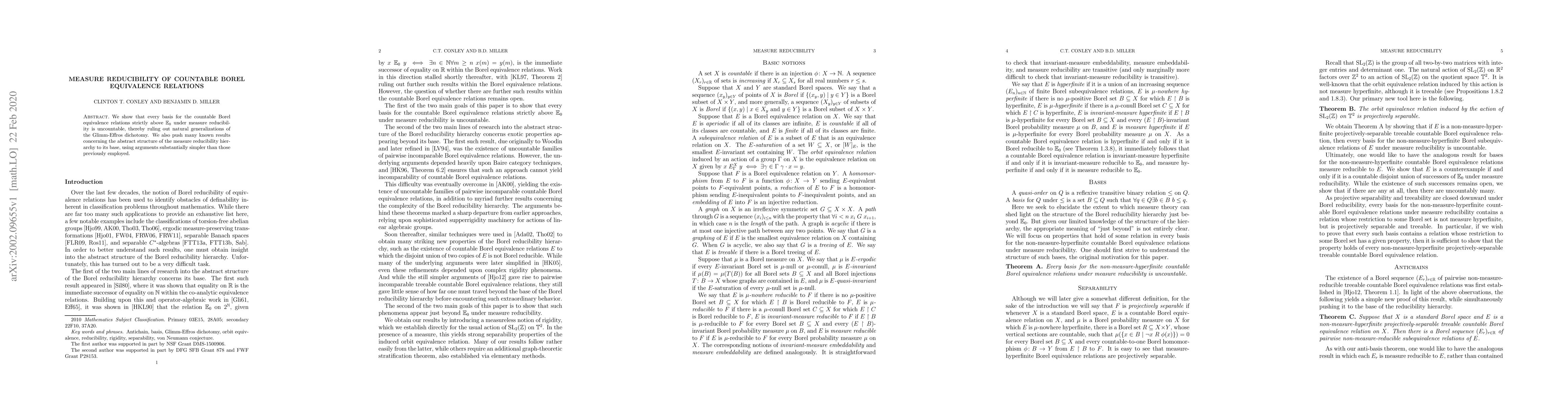 We show that every basis for the countable Borel equivalence relations strictly above $\mathbb{E}_0$ under measure reducibility is uncountable, thereby ruling out natural generalizations of the Glimm-Effros dichotomy. We also push many known results concerning the abstract structure of the measure reducibility hierarchy to its base, using arguments substantially simpler than those previously employed.