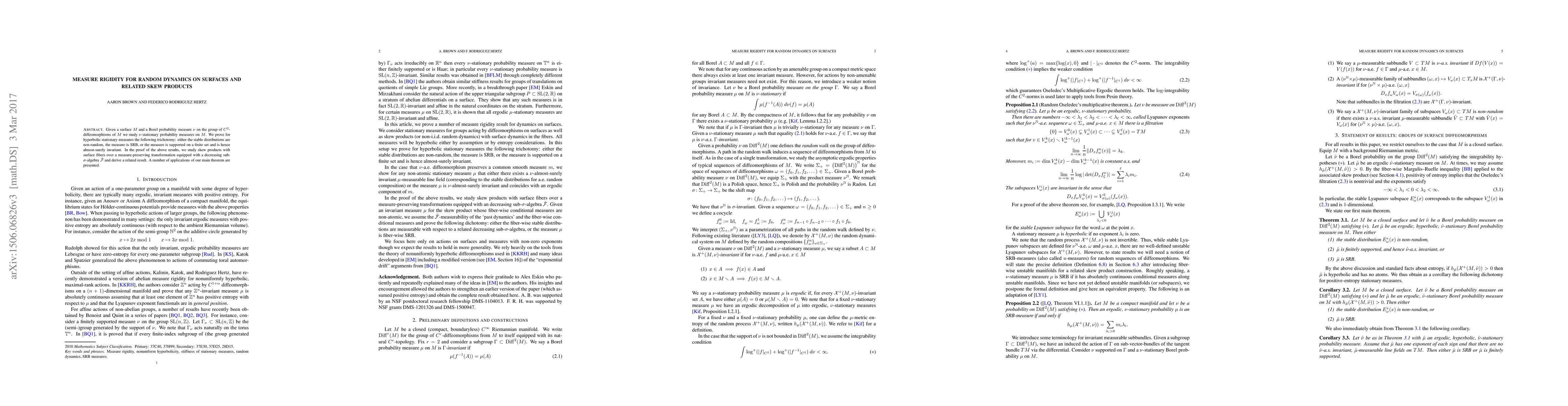 Given a surface $M$ and a Borel probability measure $\nu$ on the group of $C^2$-diffeomorphisms of $M$, we study $\nu$-stationary probability measures on $M$. We prove for hyperbolic stationary measures the following trichotomy: either the stable distributions are non-random, the measure is SRB, or the measure is supported on a finite set and is hence almost-surely invariant. In the proof of the above results, we study skew products with surface fibers over a measure preserving transformations equipped with a decreasing sub-$\sigma$-algebra $\hat {\mathcal F}$ and derive a related result. A number of applications of our main theorem are presented.