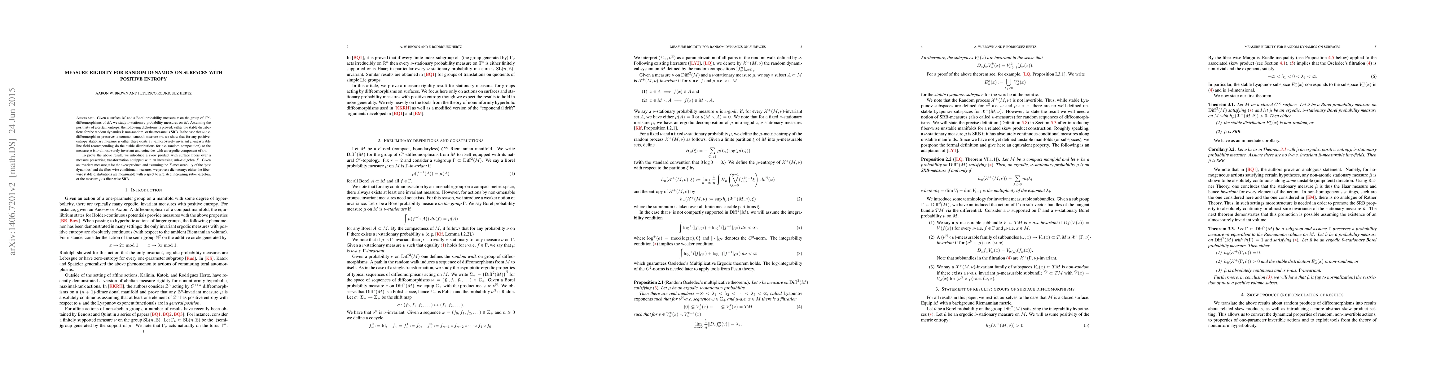 Given a surface $M$ and a Borel probability measure $\nu$ on the group of $C^2$-diffeomorphisms of $M$, we study $\nu$-stationary probability measures on $M$. Assuming the positivity of a certain entropy, the following dichotomy is proved: either the stable distributions for the random dynamics is non-random, or the measure is SRB. In the case that $\nu$-a.e. diffeomorphism preserves a common smooth measure $m$, we show that for any positive-entropy stationary measure $\mu$, either there exists a $\nu$-almost surely invariant $\mu$-measurable line field (corresponding do the stable distributions for almost every random composition) or the measure $\mu$ is $\nu$-almost surely invariant and coincides with an ergodic component of $m$. To prove the above result, we introduce a skew product with surface fibers over a measure preserving transformation equipped with an increasing sub-$\sigma$-algebra $\hat F$. Given an invariant measure $\mu$ for the skew product, and assuming the $\hat F$-measurability of the `past dynamics' and the fiber-wise conditional measures, we prove a dichotomy: either the fiber-wise stable distributions are measurable with respect to a related increasing sub-$\sigma$-algebra, or the measure $\mu$ is fiber-wise SRB.
