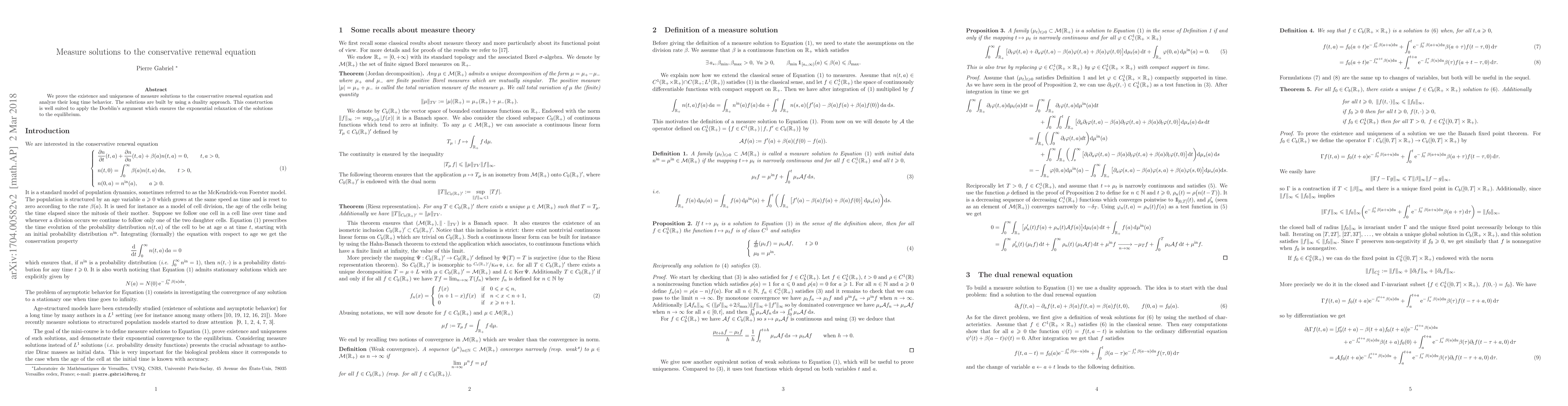 Summary: This paper establishes the existence and uniqueness of measure solutions for the conservative renewal equation, employing a duality approach and Doeblin's argument to demonstrate their exponential relaxation towards equilibrium over time.