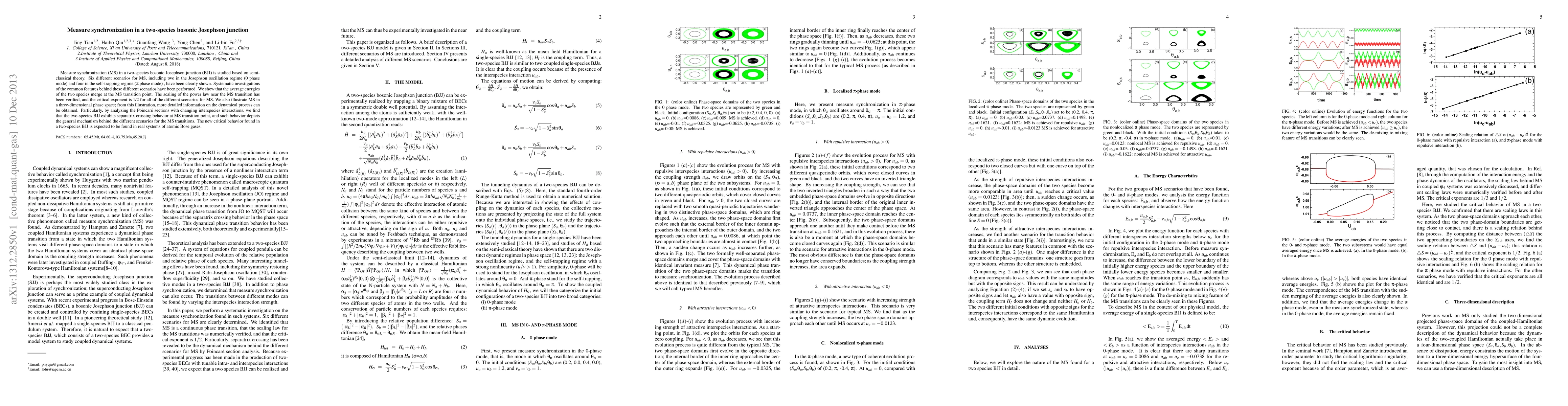 This paper investigates measure synchronization in a two-species bosonic Josephson junction using semi-classical theory, identifying six distinct scenarios. It finds that the average energies of the two species merge at the synchronization transition, with a critical exponent of 1/2, and reveals separatrix crossing behavior in the dynamical process.