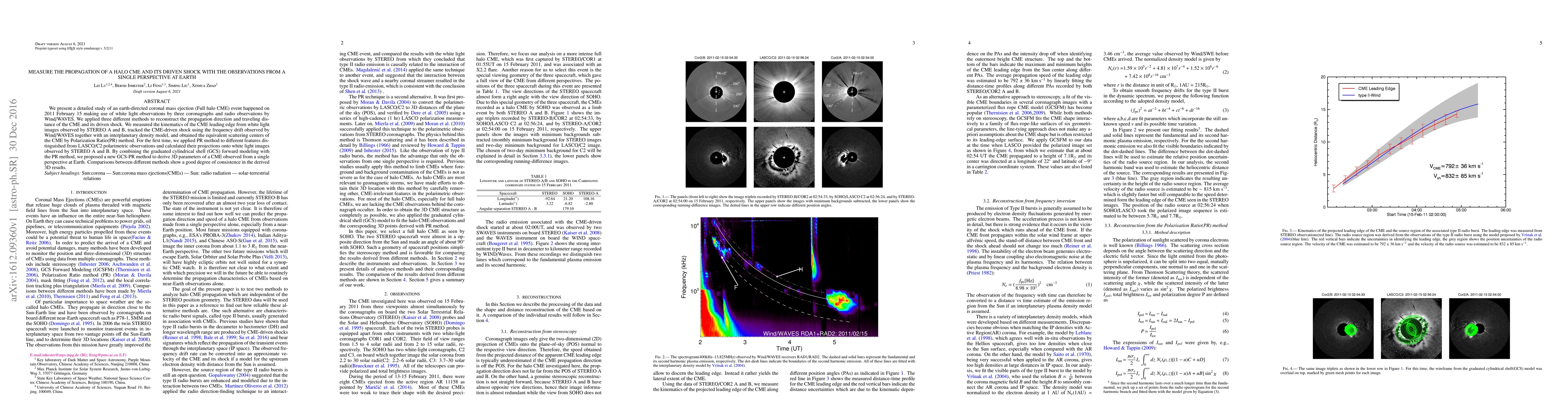 This paper studies a 2011 halo coronal mass ejection (CME) using white light and radio observations, applying multiple methods to reconstruct the CME's propagation and shock distance. A new GCS-PR method combines forward modeling with polarimetric observations to derive 3D parameters from a single Earth perspective, showing consistent results across different methods.