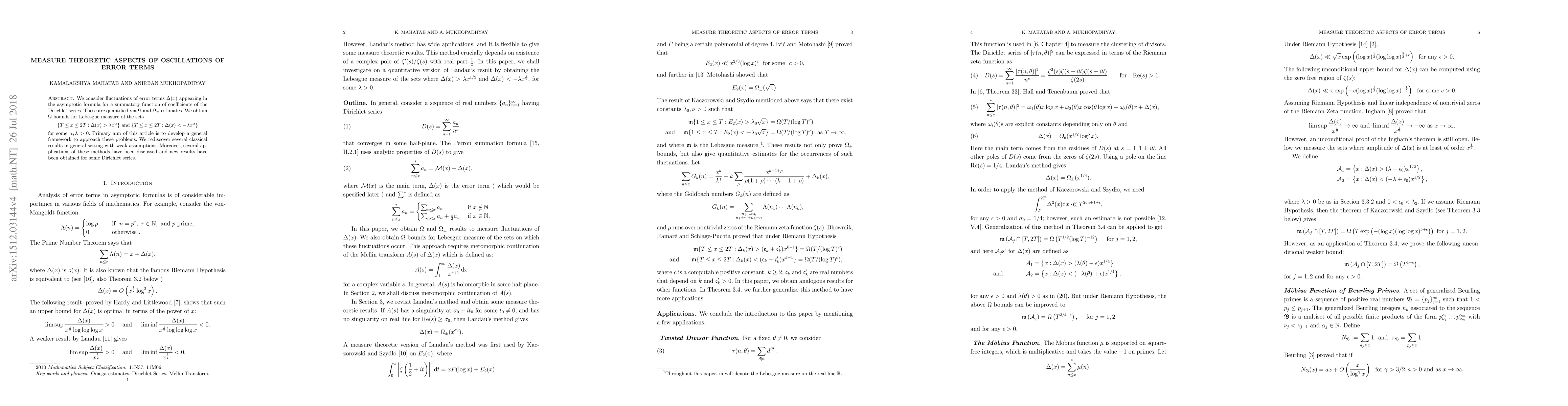 This paper develops a measure-theoretic framework to quantify fluctuations in error terms $\Delta(x)$ of Dirichlet series summatory functions, obtaining $\Omega$ bounds for the Lebesgue measure of specific sets. It rediscovers classical results under weak assumptions and applies these methods to derive new results for certain Dirichlet series.