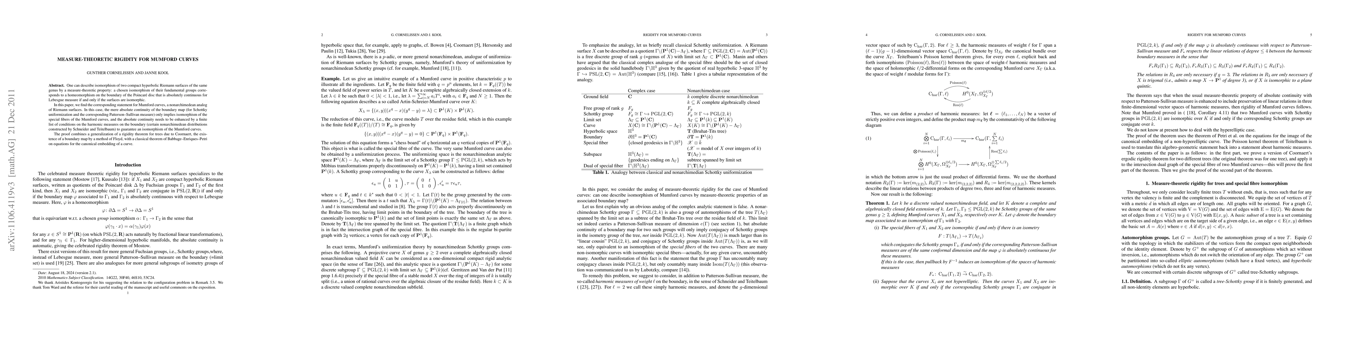 This paper establishes the measure-theoretic rigidity for Mumford curves, showing that isomorphism of these nonarchimedean analogs of Riemann surfaces requires more than just absolute continuity of boundary maps; it necessitates additional conditions on harmonic measures to ensure full isomorphism. The proof integrates a generalized rigidity theorem for trees and classical results on canonical curve embeddings.