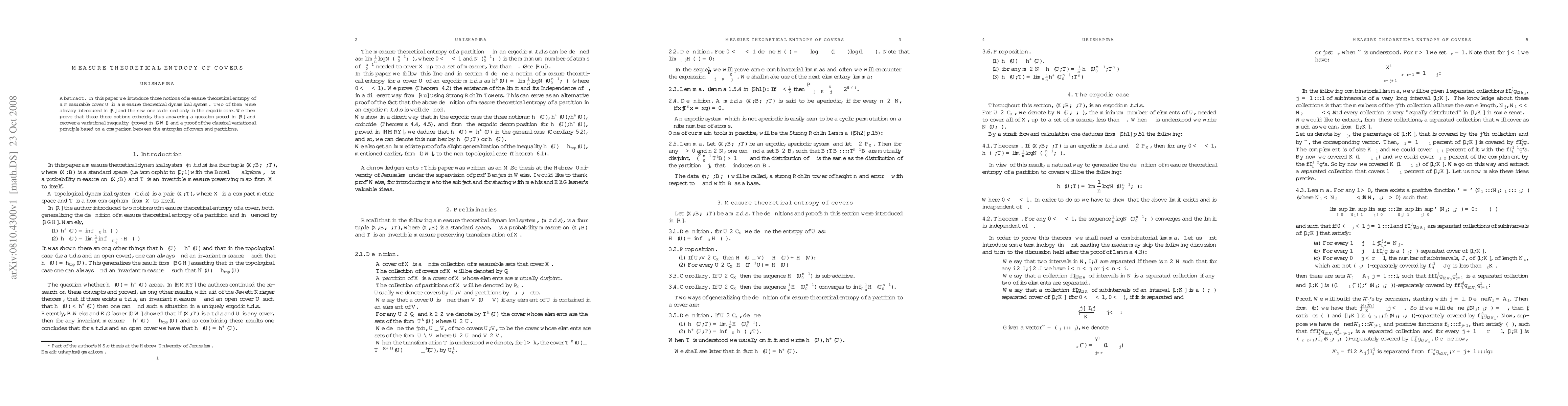 In this paper we introduce three notions of measure theoretical entropy of a measurable cover U in a measure theoretical dynamical system. Two of them were already introduced in [R] and the new one is defined only in the ergodic case. We then prove that these three notions coincide, thus answering a question posed in [R] and recover a variational inequality (proved in [GW]) and a proof of the classical variational principle based on a comparison between the entropies of covers and partitions.