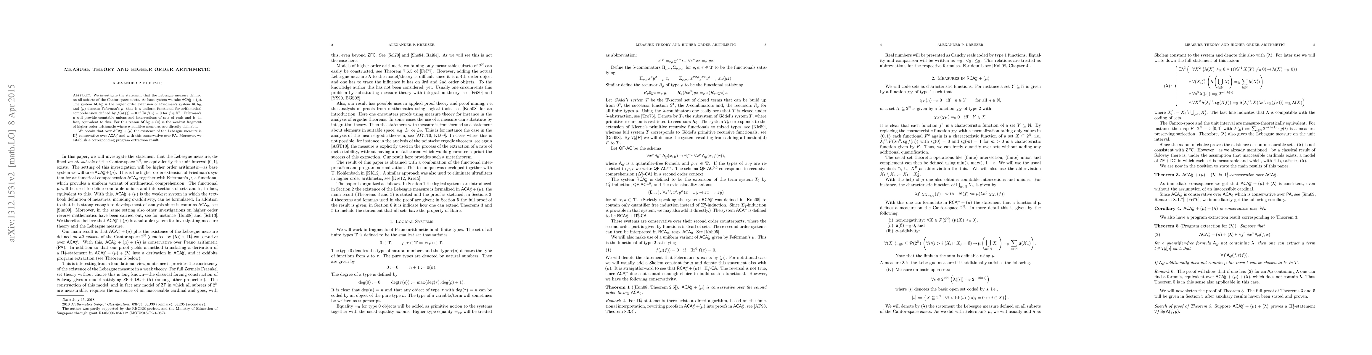 This paper explores the existence of the Lebesgue measure on all subsets of the Cantor space within the framework of higher order arithmetic, specifically $\mathsf{ACA}_0^\omega + (\mu)$. The authors demonstrate that this existence is $\Pi^1_2$-conservative over $\mathsf{ACA}_0^\omega$ and $\mathsf{PA}$, and provide a program extraction result.