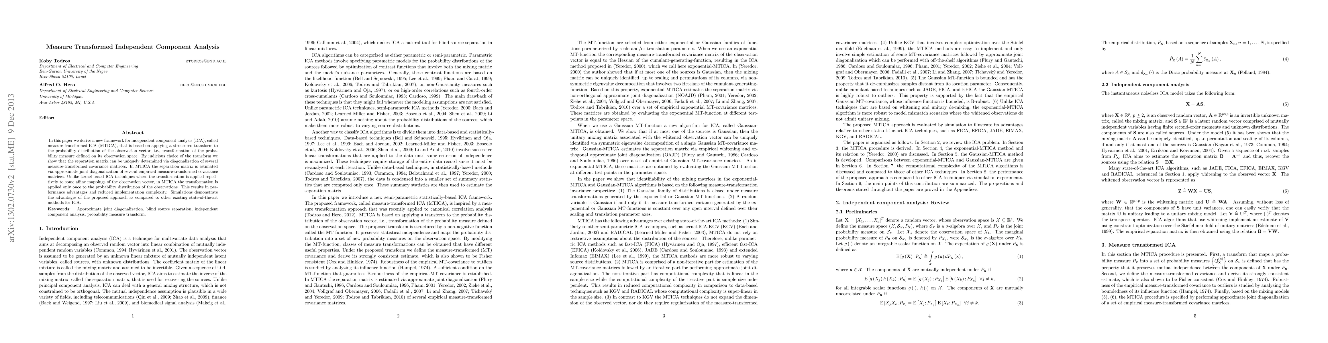 The paper introduces measure-transformed ICA (MTICA), a novel ICA framework that applies a structured transform to the observation vector's probability distribution, enabling unique determination of the separation matrix via diagonalization. MTICA offers performance benefits and reduced complexity compared to kernel-based ICA, as demonstrated through simulations.