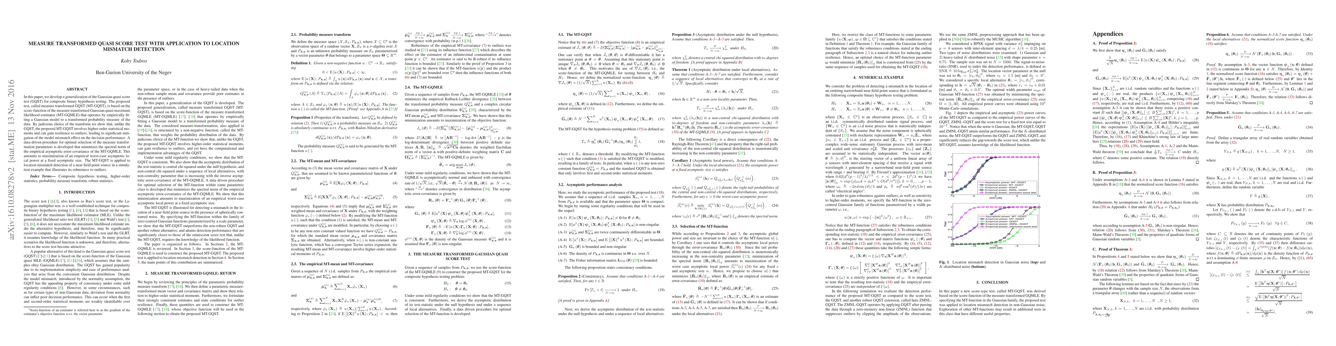 This paper introduces a measure transformed Gaussian quasi score test (MT-GQST) for composite binary hypothesis testing, which leverages higher-order moments and is more resilient to outliers compared to the Gaussian quasi score test. The method is applied to detect location mismatch in near-field point source simulations, demonstrating improved robustness.