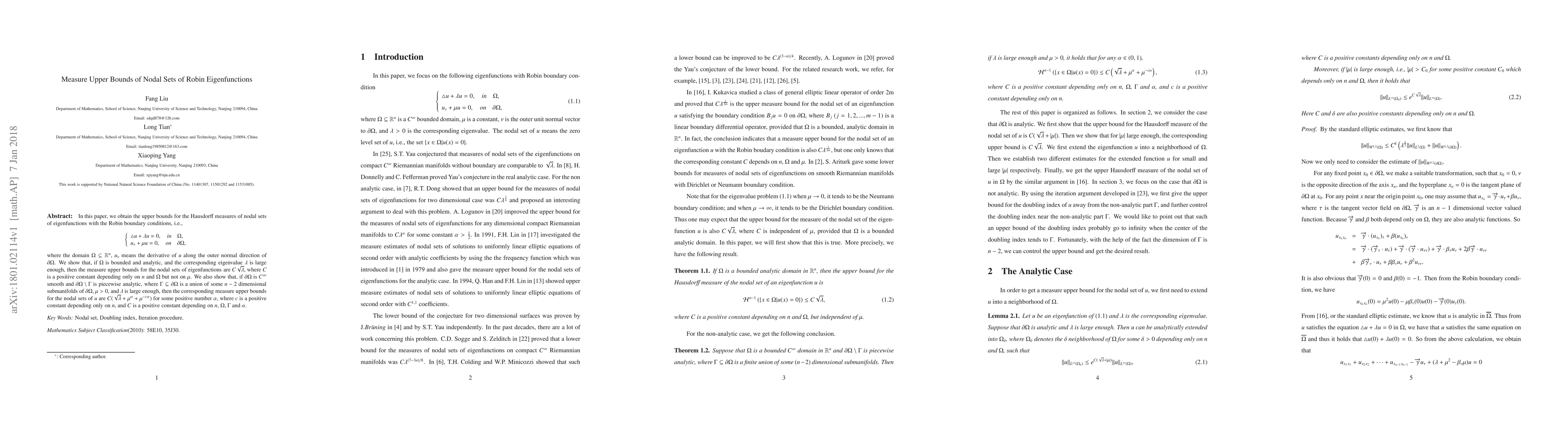In this paper, we obtain the upper bounds for the Hausdorff measures of nodal sets of eigenfunctions with the Robin boundary conditions, i.e., \begin{equation*} {\left\{\begin{array}{l} \triangle u+\lambda u=0,\quad in\quad \Omega,\\ u_{\nu}+\mu u=0,\quad on\quad\partial\Omega, \end{array} \right.} \end{equation*} where the domain $\Omega\subseteq\mathbb{R}^n$, $u_{\nu}$ means the derivative of $u$ along the outer normal direction of $\partial\Omega$. We show that, if $\Omega$ is bounded and analytic, and the corresponding eigenvalue $\lambda$ is large enough,then the measure upper bounds for the nodal sets of eigenfunctions are $C\sqrt{\lambda}$, where $C$ is a positive constant depending only on $n$ and $\Omega$ but not on $\mu$ We also show that, if $\partial\Omega$ is $C^{\infty}$ smooth and $\partial\Omega\setminus\Gamma$ is piecewise analytic, where $\Gamma\subseteq\partial\Omega$ is a union of some $n-2$ dimensional submanifolds of $\partial\Omega$, $\mu>0$, and $\lambda$ is large enough, then the corresponding measure upper bounds for the nodal sets of $u$ are $C(\sqrt{\lambda}+\mu^{\alpha}+\mu^{-c\alpha})$ for some positive number $\alpha$, where $c$ is a positive constant depending only on $n$, and $C$ is a positive constant depending on $n$, $\Omega$, $\Gamma$ and $\alpha$.