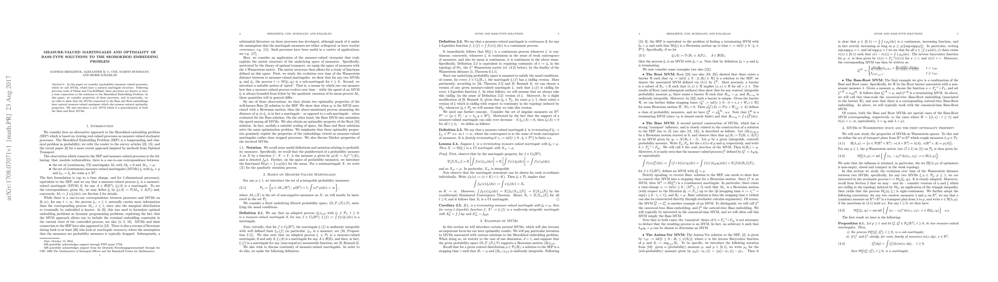 In this paper we consider (probability-)measure valued processes, which we call MVMs, which have a natural martingale structure. Following previous work of Eldan and Cox-K\"allblad, these processes are known to have a close connection to the solutions to the Skorokhod Embedding Problem. In this paper, we consider properties of these processes, and in particular, we are able to show that the MVMs connected to the Bass and Root embeddings have natural measure-valued analogues which also possess natural optimality properties. We also introduce a new MVM which is a generalisation of both the Bass and Root MVMs.