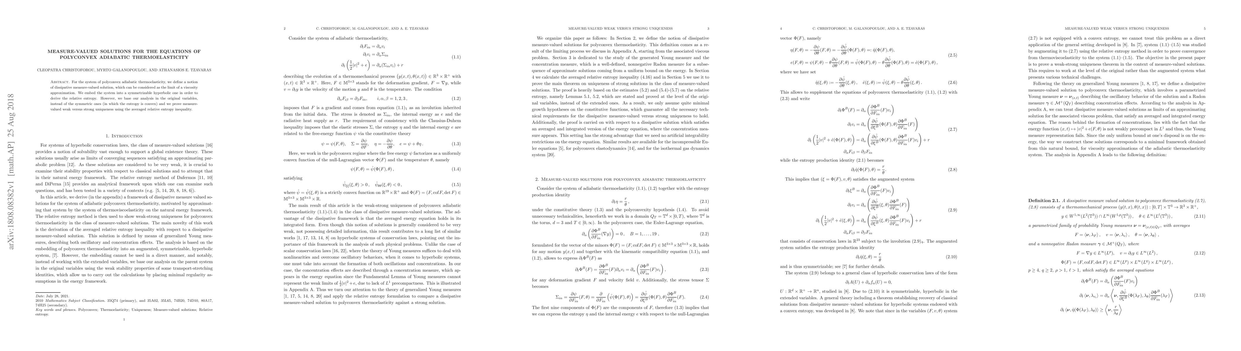 This paper defines dissipative measure-valued solutions for polyconvex adiabatic thermoelasticity, embedding the system into a symmetrizable hyperbolic form to derive relative entropy. It proves measure-valued weak versus strong uniqueness using averaged relative entropy inequality, analyzing the system in its original variables.
