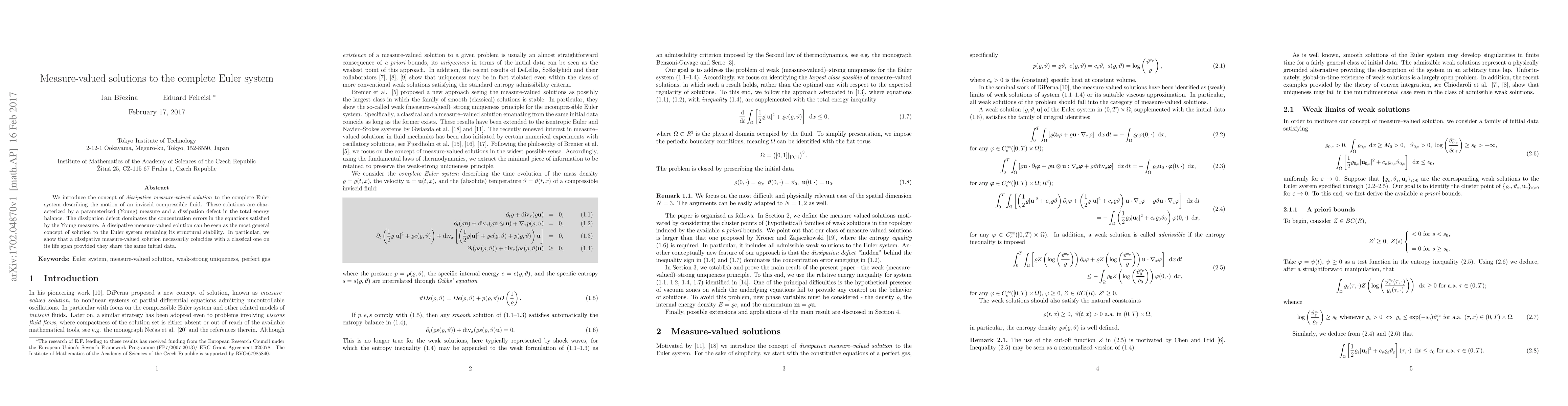 We introduce the concept of dissipative measure-valued solution to the complete Euler system describing the motion of an inviscid compressible fluid. These solutions are characterized by a parameterized (Young) measure and a dissipation defect in the total energy balance. The dissipation defect dominates the concentration errors in the equations satisfied by the Young measure. A dissipative measure-valued solution can be seen as the most general concept of solution to the Euler system retaining its structural stability. In particular, we show that a dissipative measure-valued solution necessarily coincides with a classical one on its life span provided they share the same initial data.