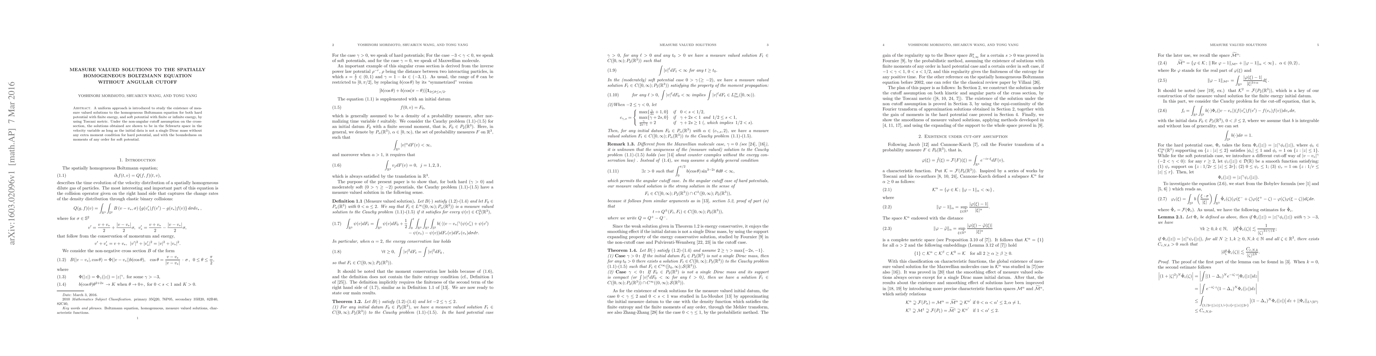 A uniform approach is introduced to study the existence of measure valued solutions to the homogeneous Boltzmann equation for both hard potential with finite energy, and soft potential with finite or infinite energy, by using Toscani metric. Under the non-angular cutoff assumption on the cross-section, the solutions obtained are shown to be in the Schwartz space in the velocity variable as long as the initial data is not a single Dirac mass without any extra moment condition for hard potential, and with the boundedness on moments of any order for soft potential.
