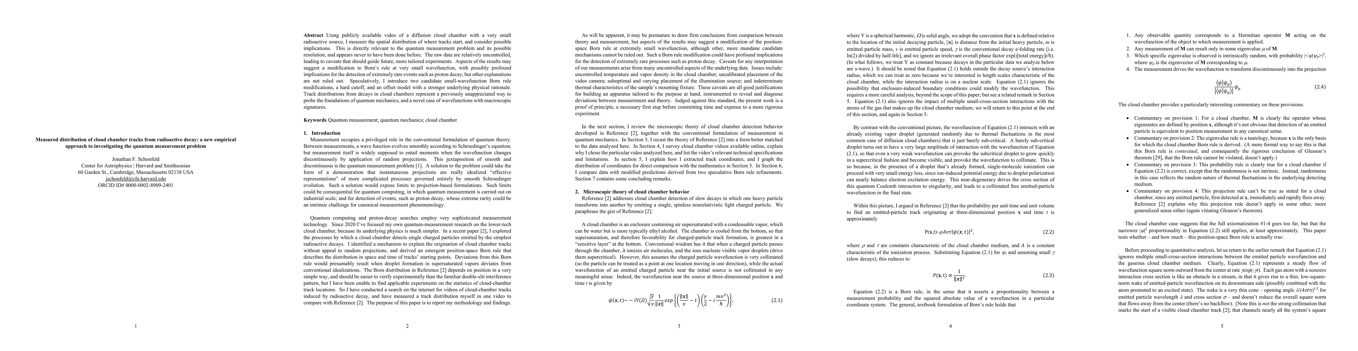 Using publicly available video of a diffusion cloud chamber with a very small radioactive source, I measure the spatial distribution of where tracks start, and consider possible implications. This is directly relevant to the quantum measurement problem and its possible resolution, and appears never to have been done before. The raw data are relatively uncontrolled, leading to caveats that should guide future, more tailored experiments. Aspects of the results may suggest a modification to Born's rule at very small wavefunction, with possibly profound implications for the detection of extremely rare events such as proton decay, but other explanations are not ruled out. Speculatively, I introduce two candidate small-wavefunction Born rule modifications, a hard cutoff, and an offset model with a stronger underlying physical rationale. Track distributions from decays in cloud chambers represent a previously unappreciated way to probe the foundations of quantum mechanics, and a novel case of wavefunctions with macroscopic signatures.
